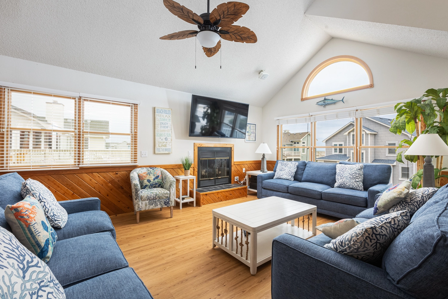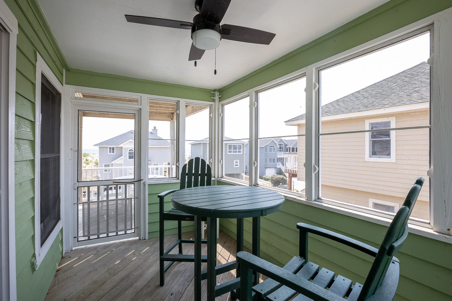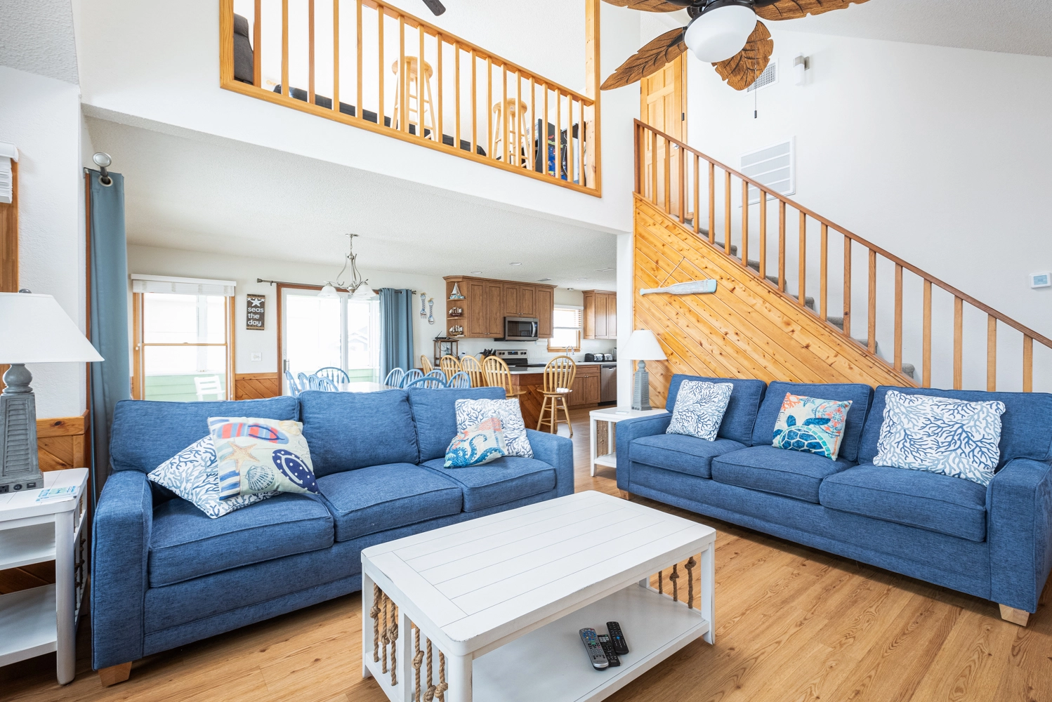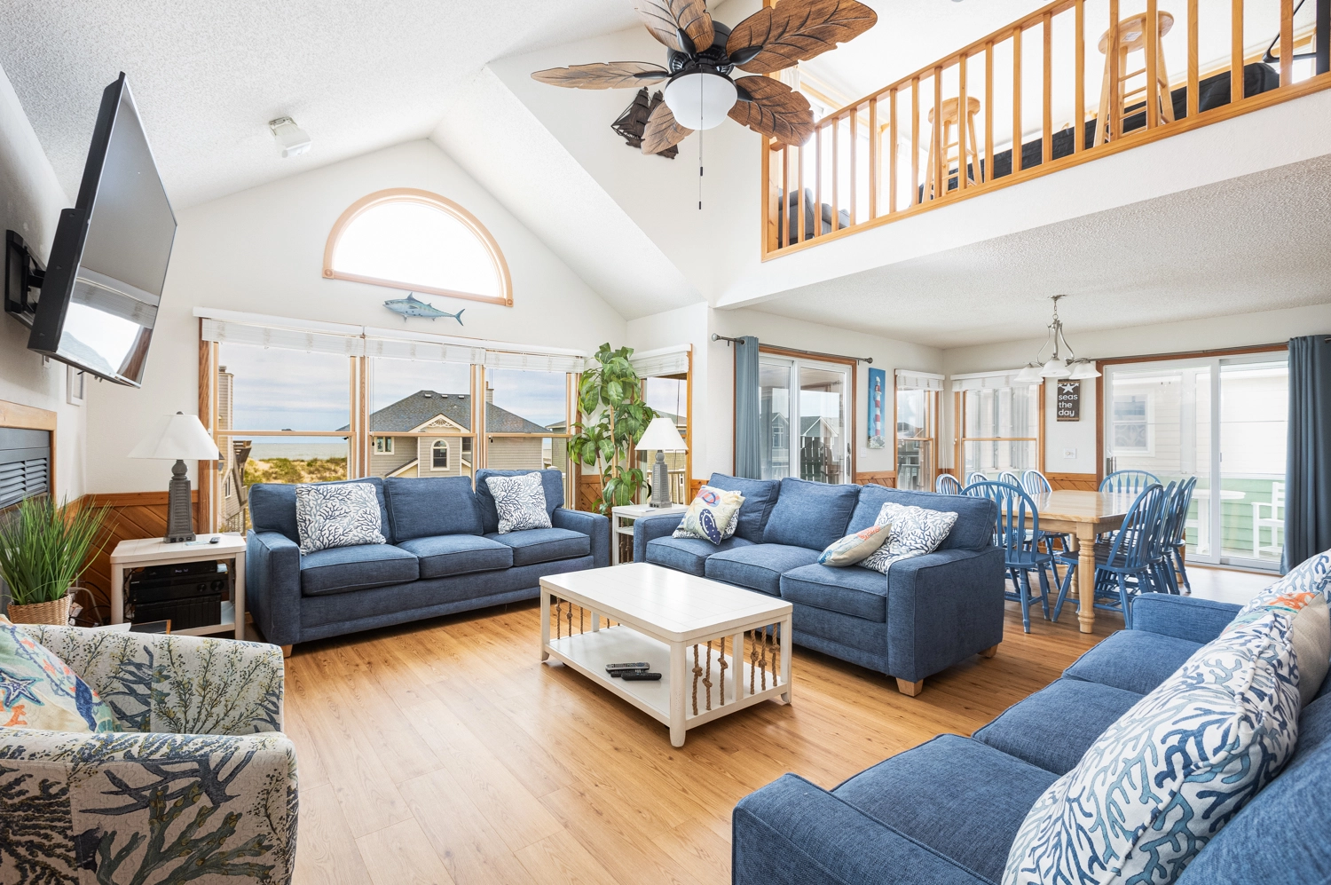 Great room with sound system; kitchen; dining area; screened porch; covered and open decks with ocean views.