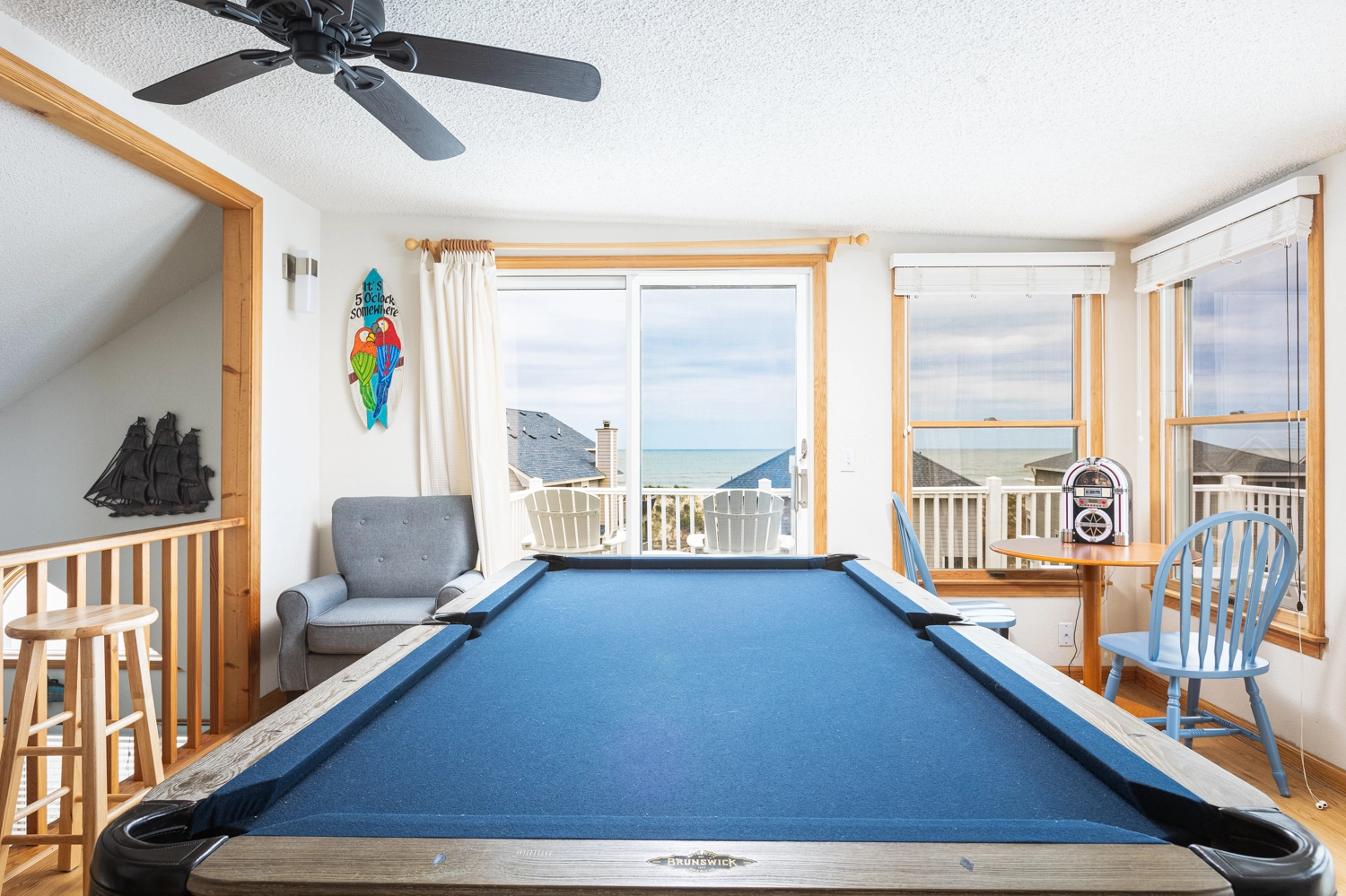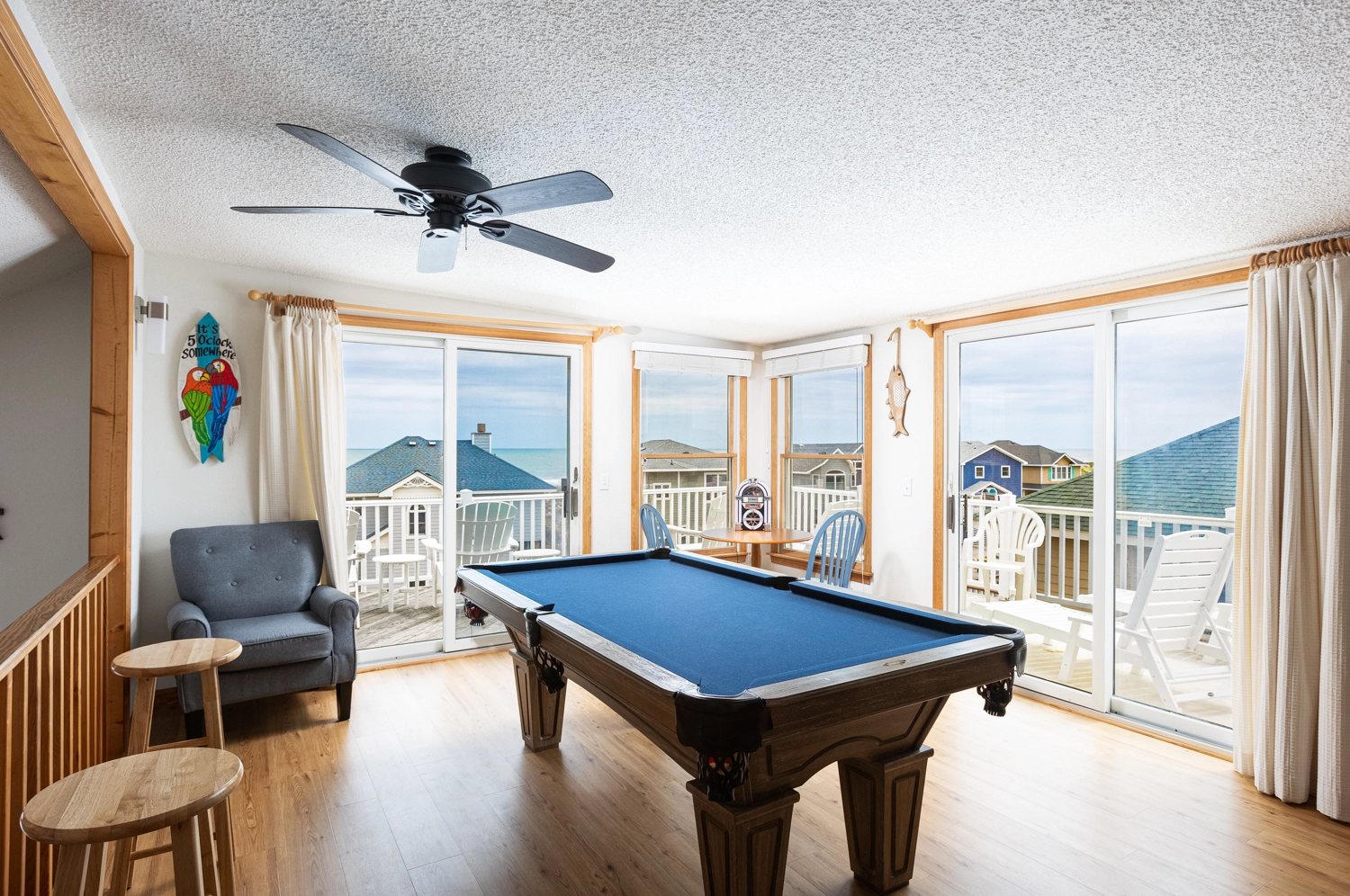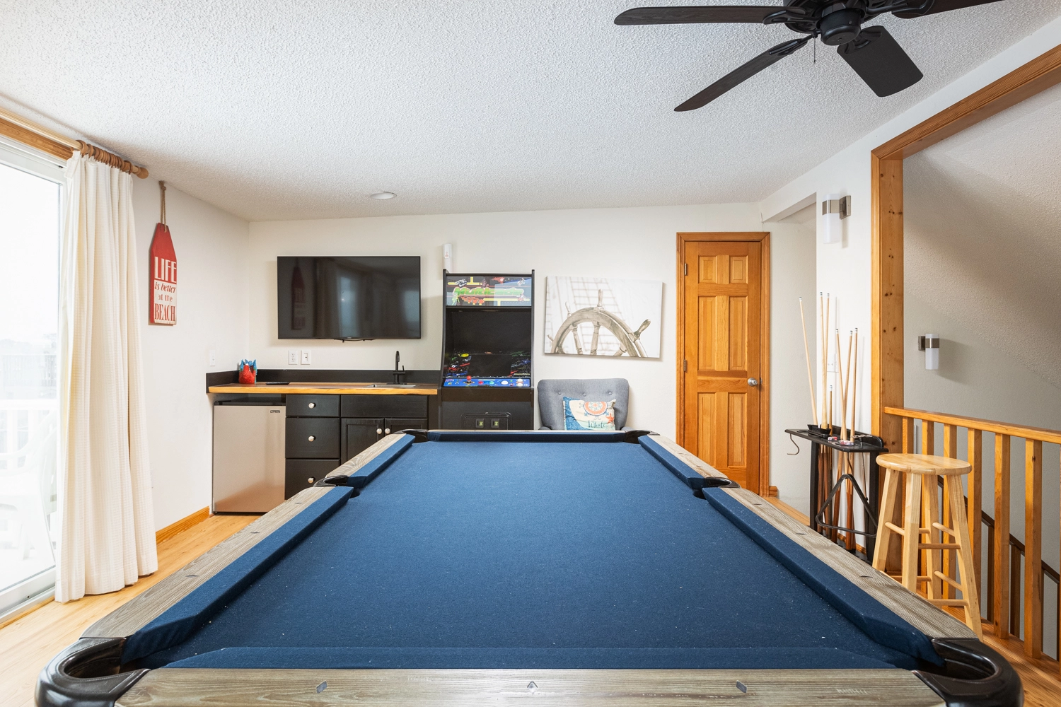 Loft rec room with 7' pool table, arcade game and wet bar; open decks with ocean views.