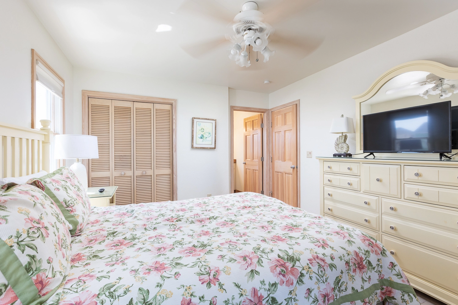 "excellent view, the best we have ever had oceanfront! Kitchen is well stocked, most beds comfortable. loved having the beach chairs for use and the private path to the beach. The only downside is the master bath rainhead shower has very little pressure, hard to rinse all the sand off! also the upstairs TV only has a vcr vs dvd??? The seating is better upstairs for the family. Overall a very nice stay."
