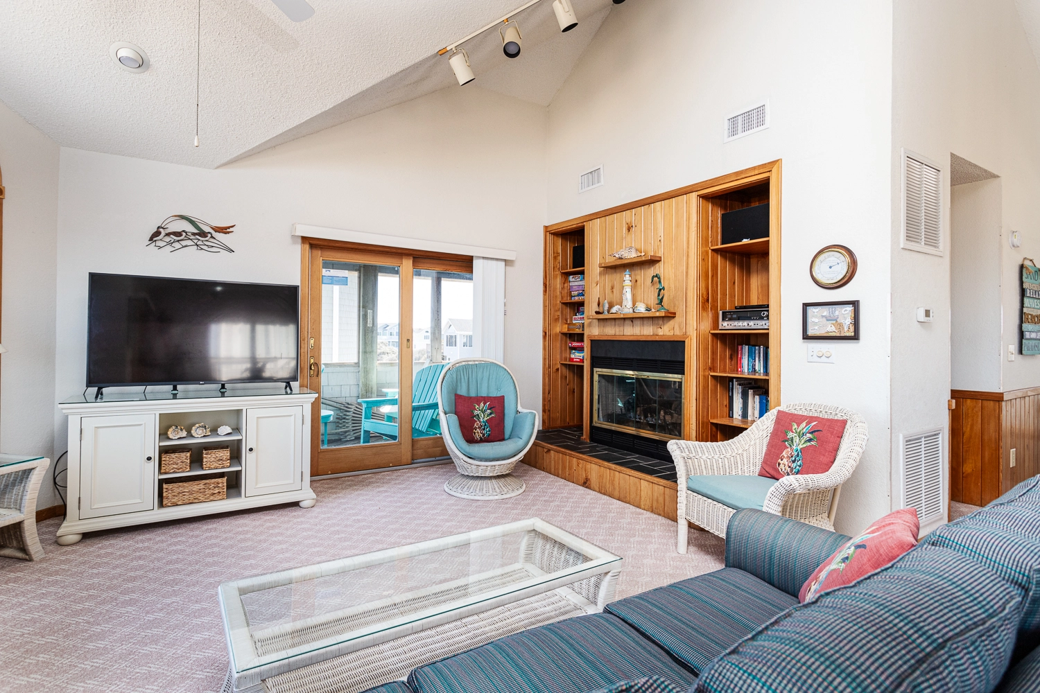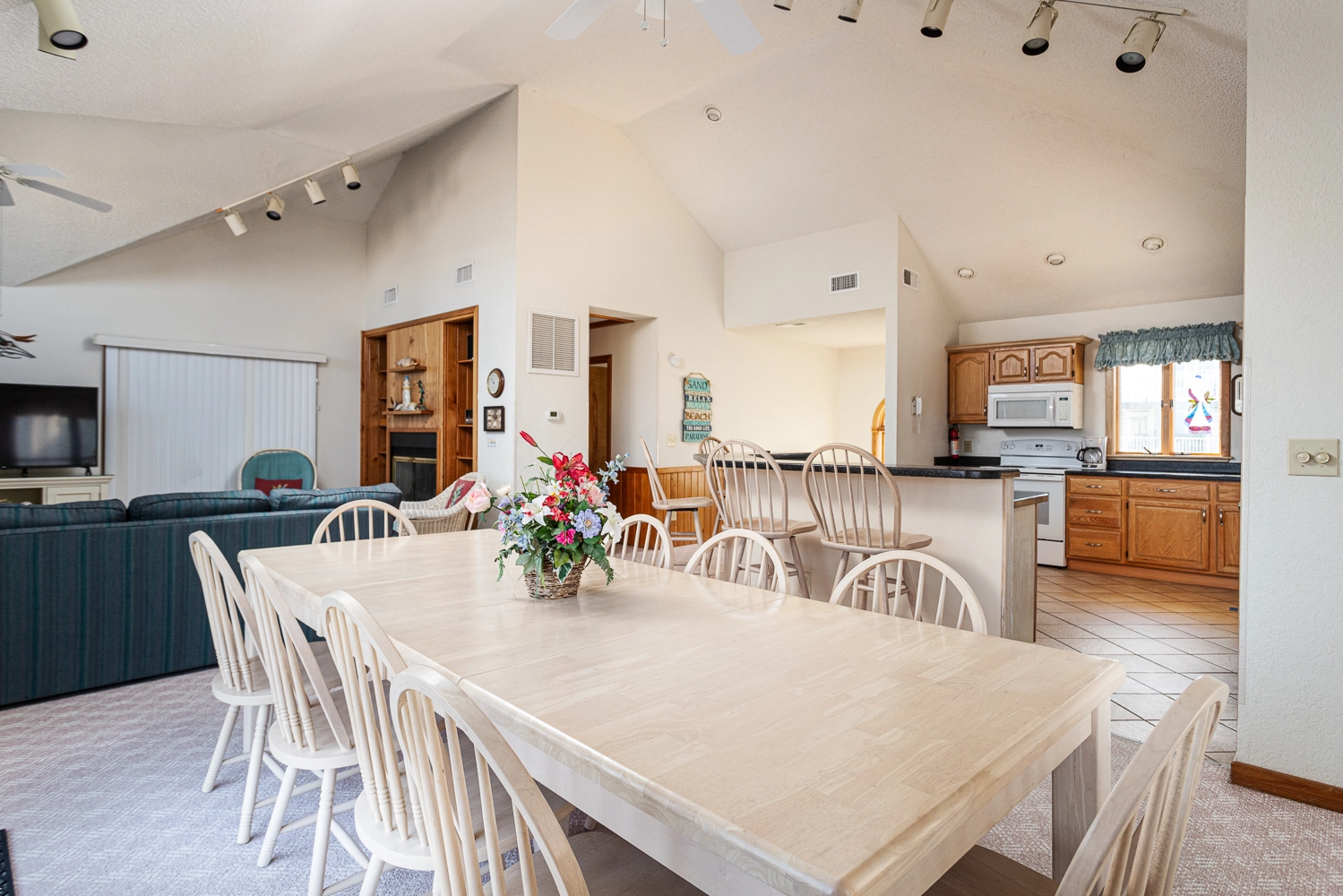 Great room; kitchen with breakfast bar; dining area; screened porch.