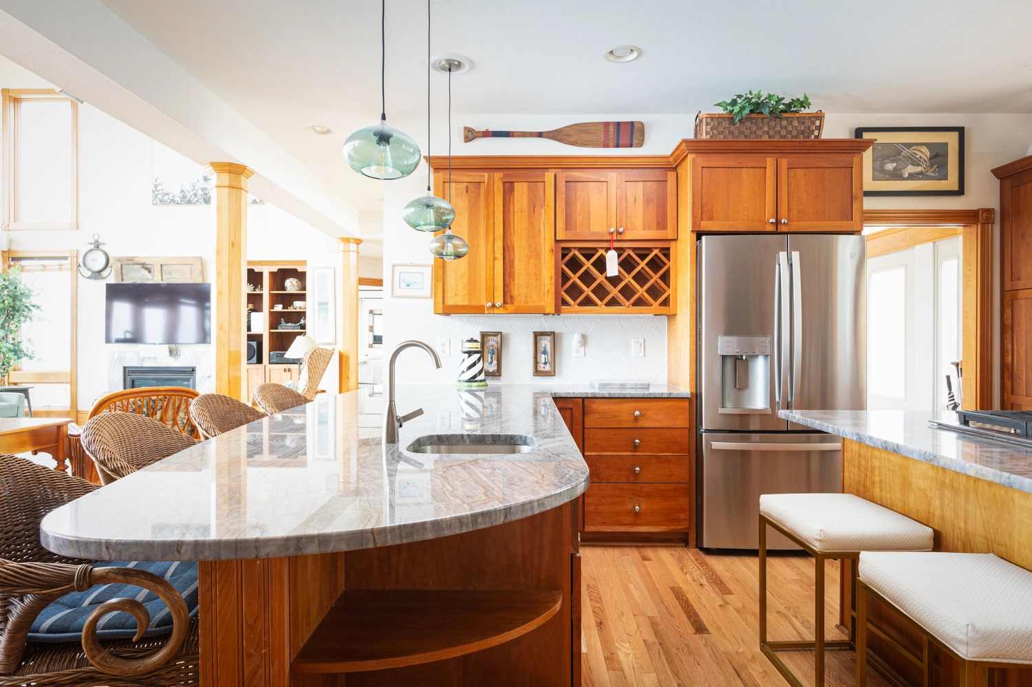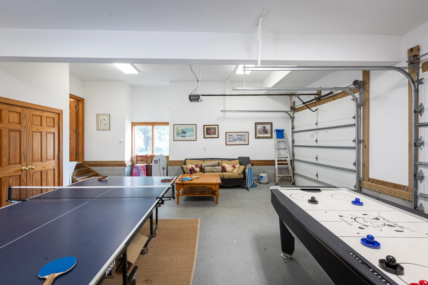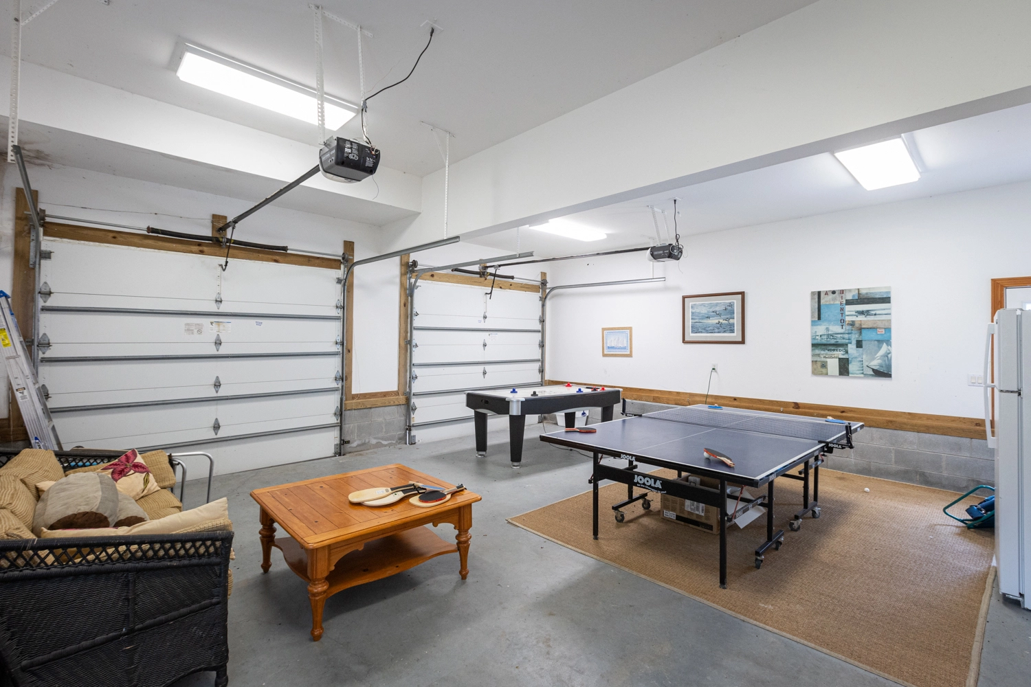 Great room with gas fireplace, kitchen with two dishwashers, dining area, rec room in the garage area with air hockey, ping pong and refrigerator, screened porch, laundry.