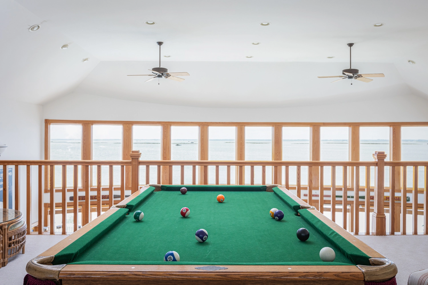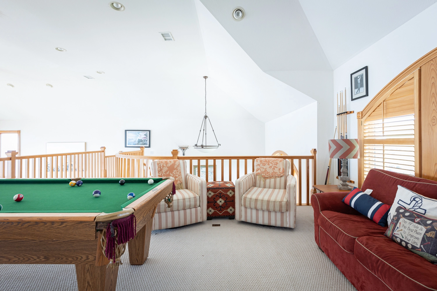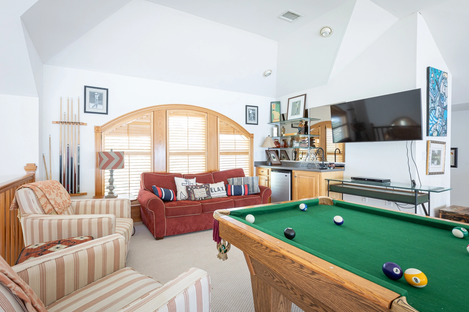 Rec room with pool table, and wet bar with beverage refrigerator.