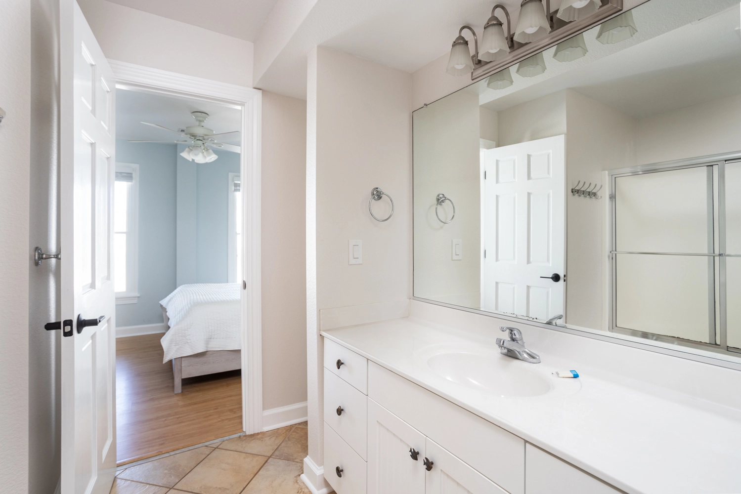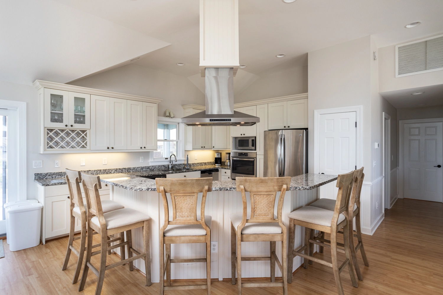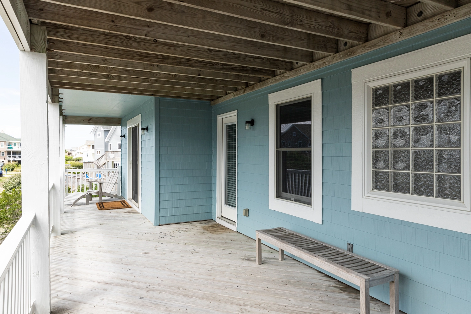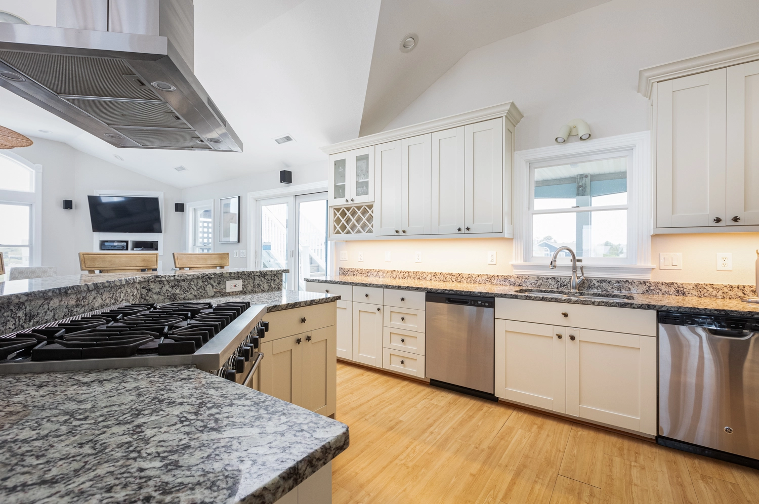 "No carpet was a great plus. All the decking was in great shape...no splinters for little feet. The walk to the beach was just the right length. The large number of plates, flatware, bowls and coffee mugs and the two dishwashers made meals easier. The bathrooms, especially the top floor master, were awesome. The pool was perfect temp since we paid to have it heated. Having two sets of washer and dryer made life so easy for all visitors. Loads of parking for everyone."