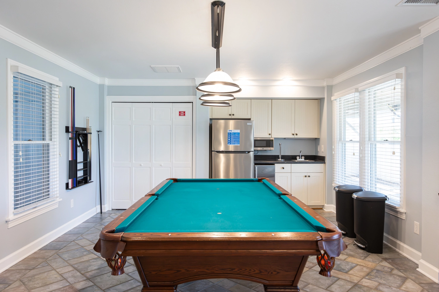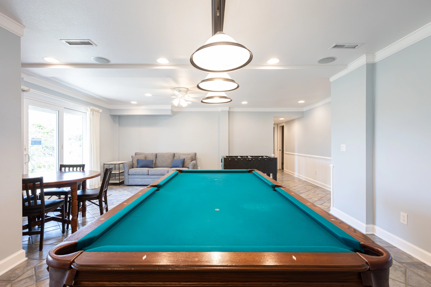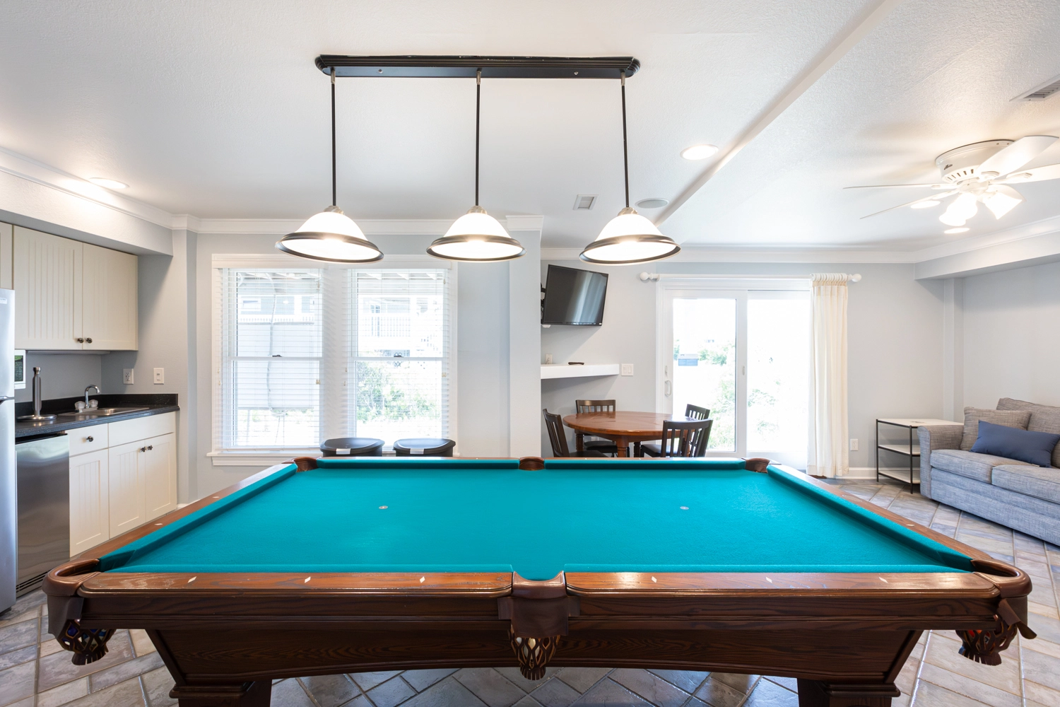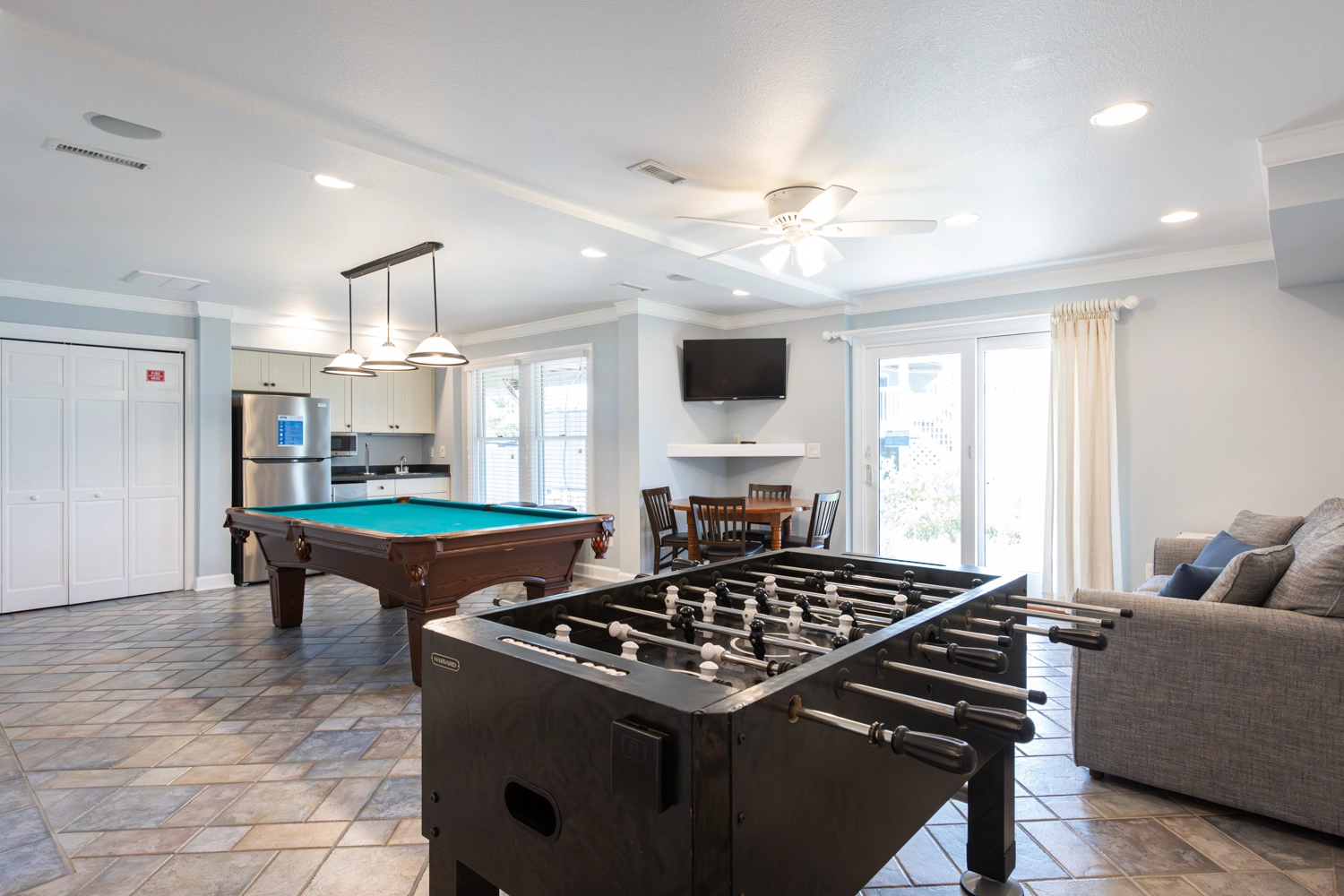 Rec room (QSS) with pool table, foosball, kitchenette with refrigerator, ice maker, and microwave; laundry.