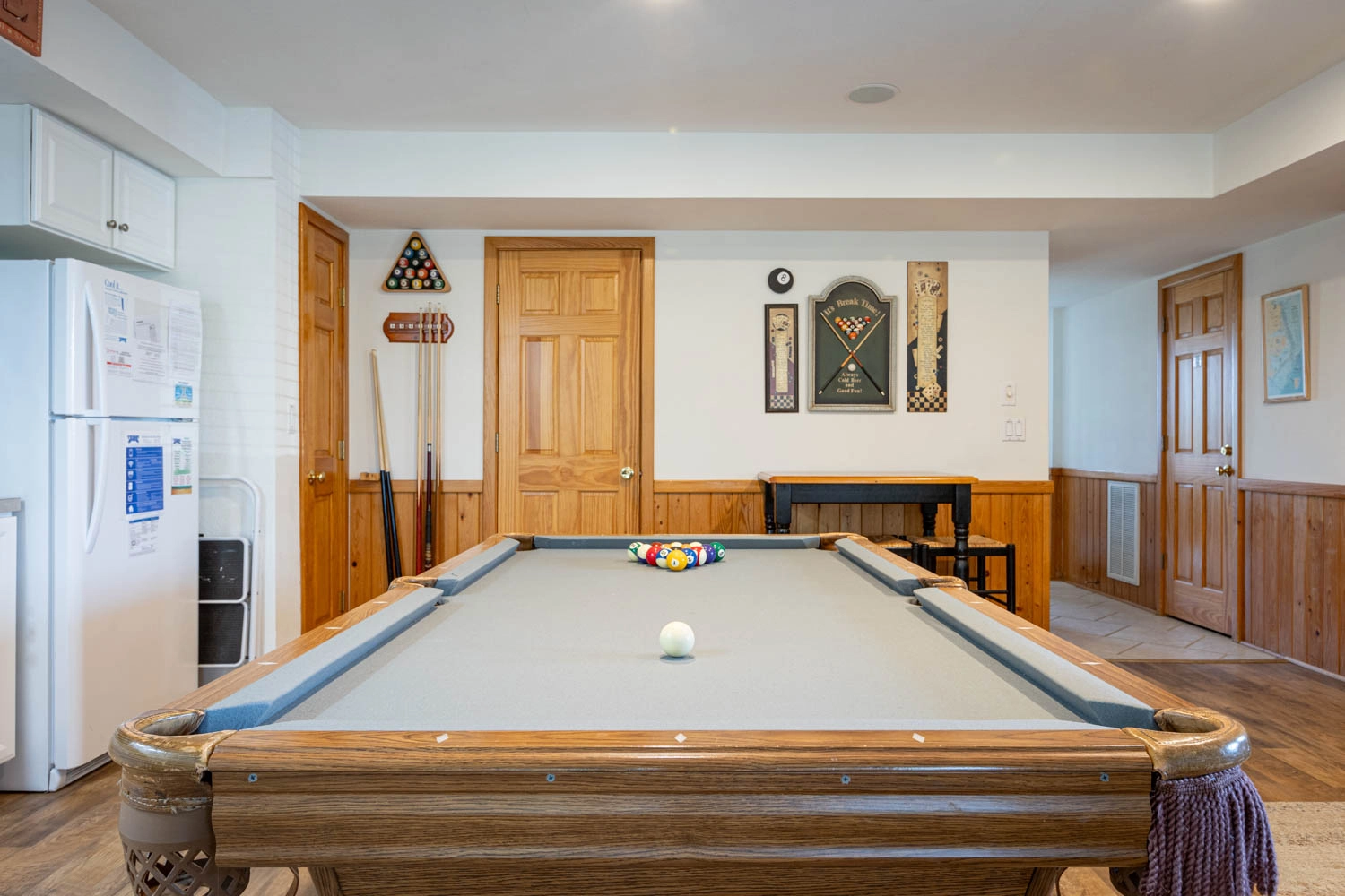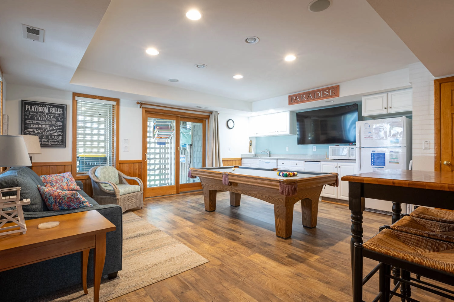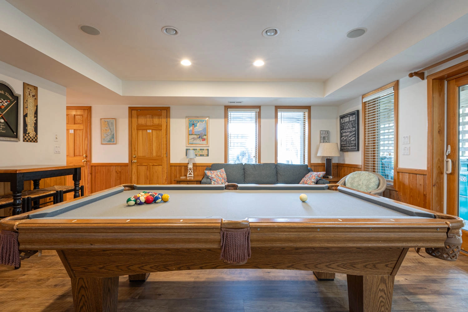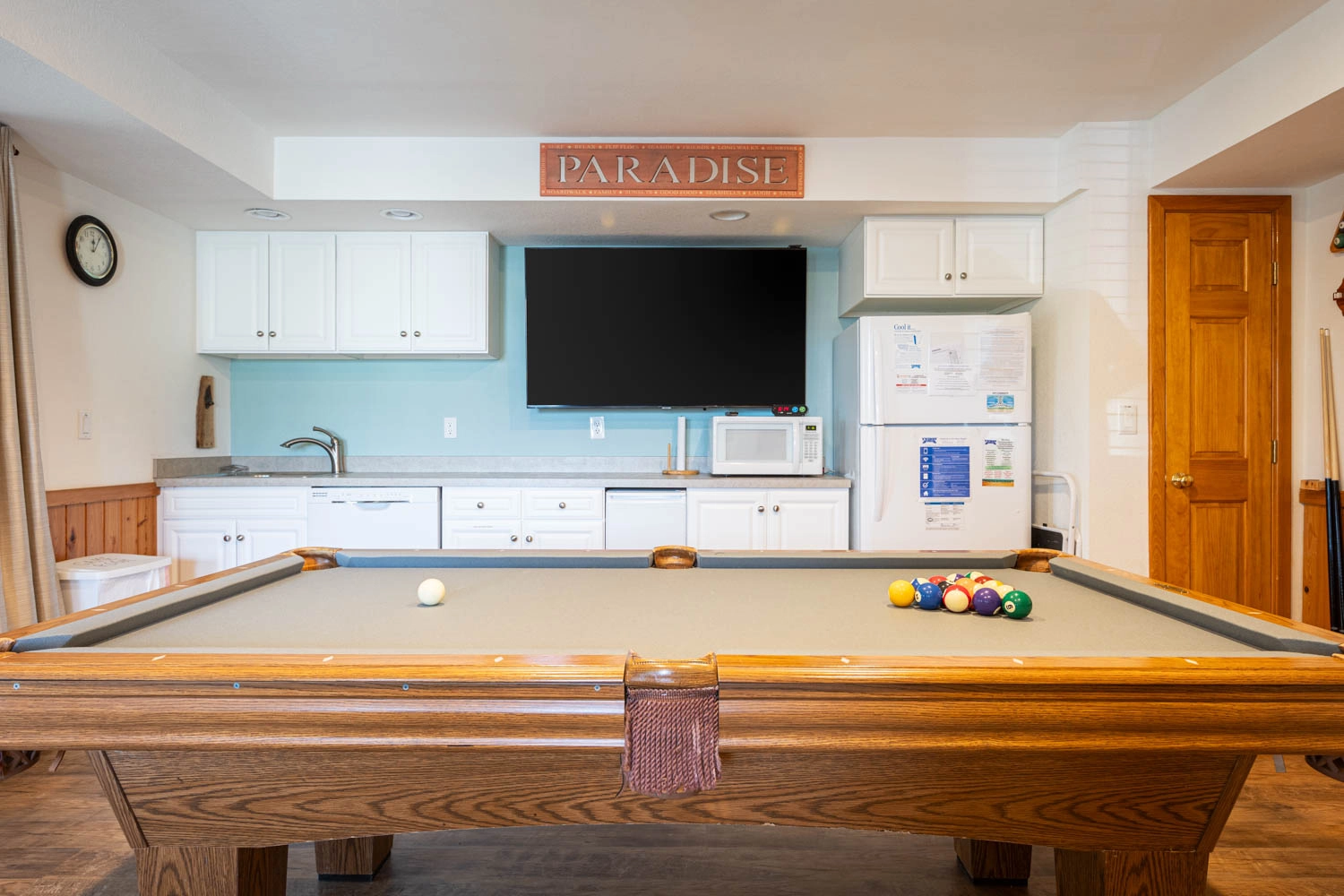 Rec room with pool table, wet bar, dishwasher and microwave; patio with access to gated private pool, hot tub, cabana, and gas grill.