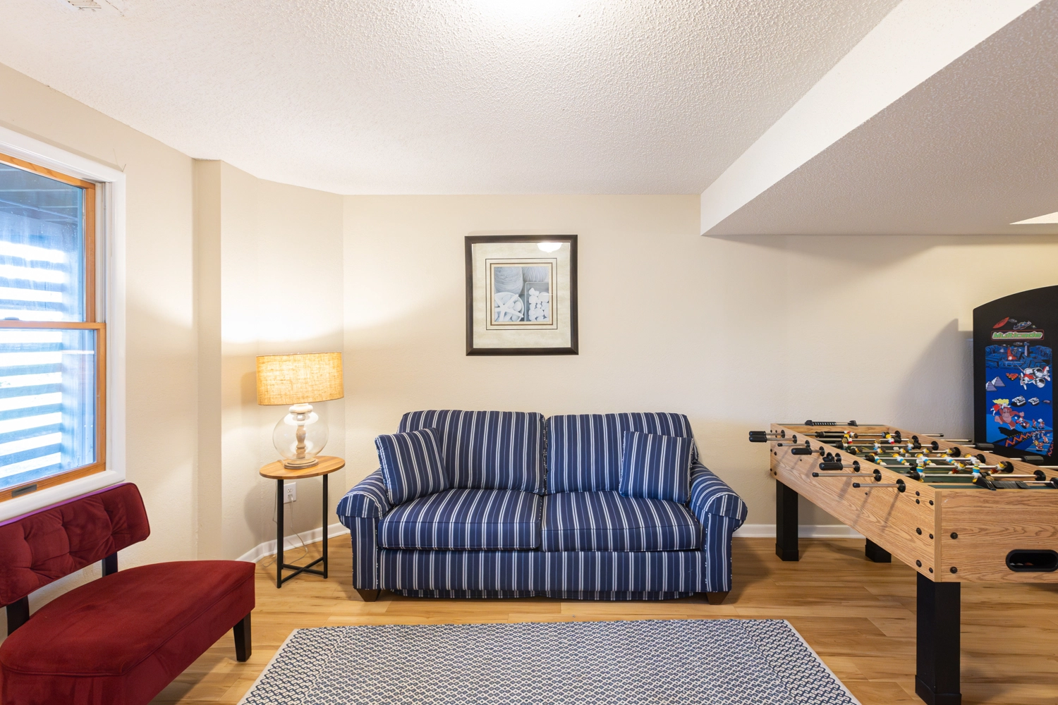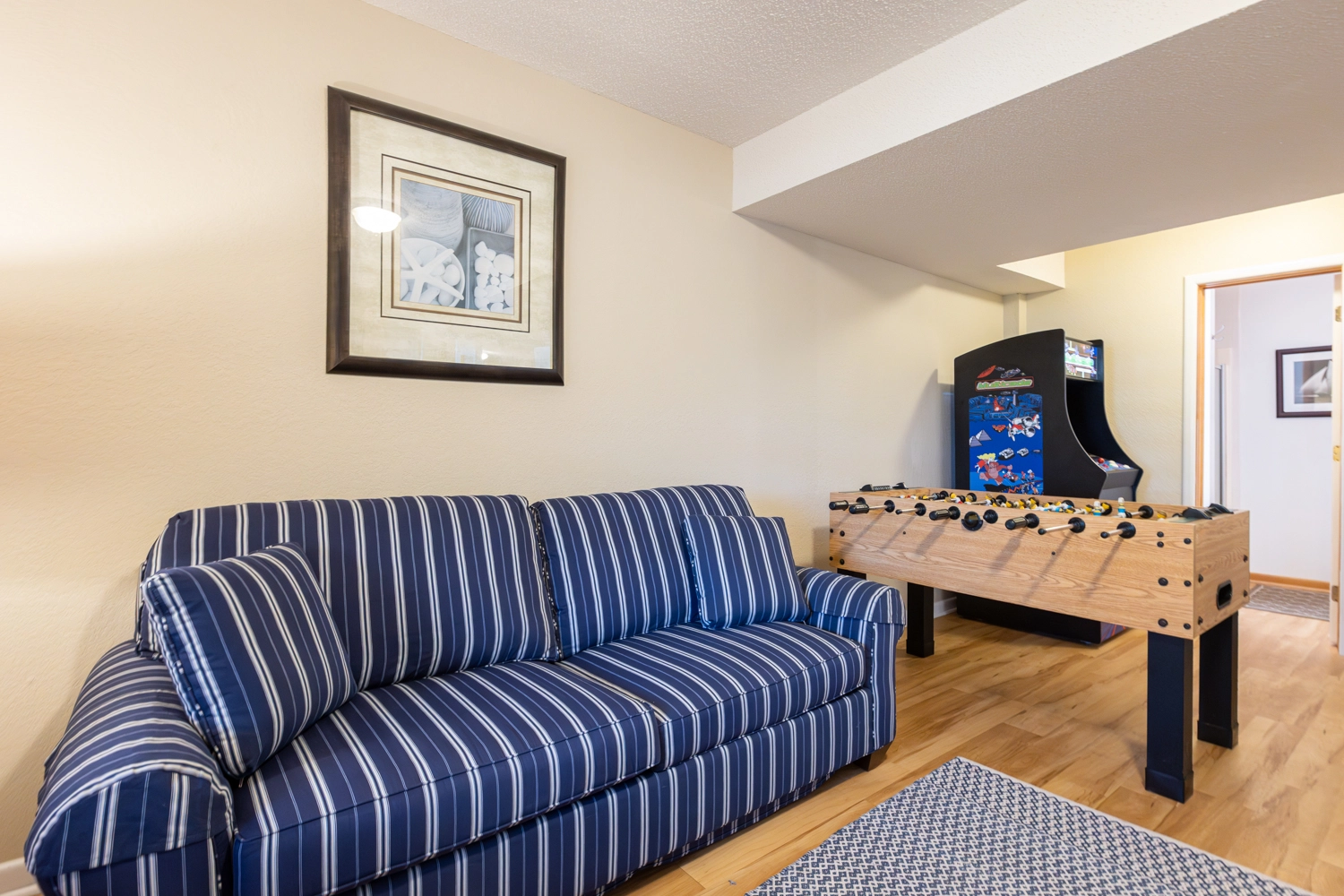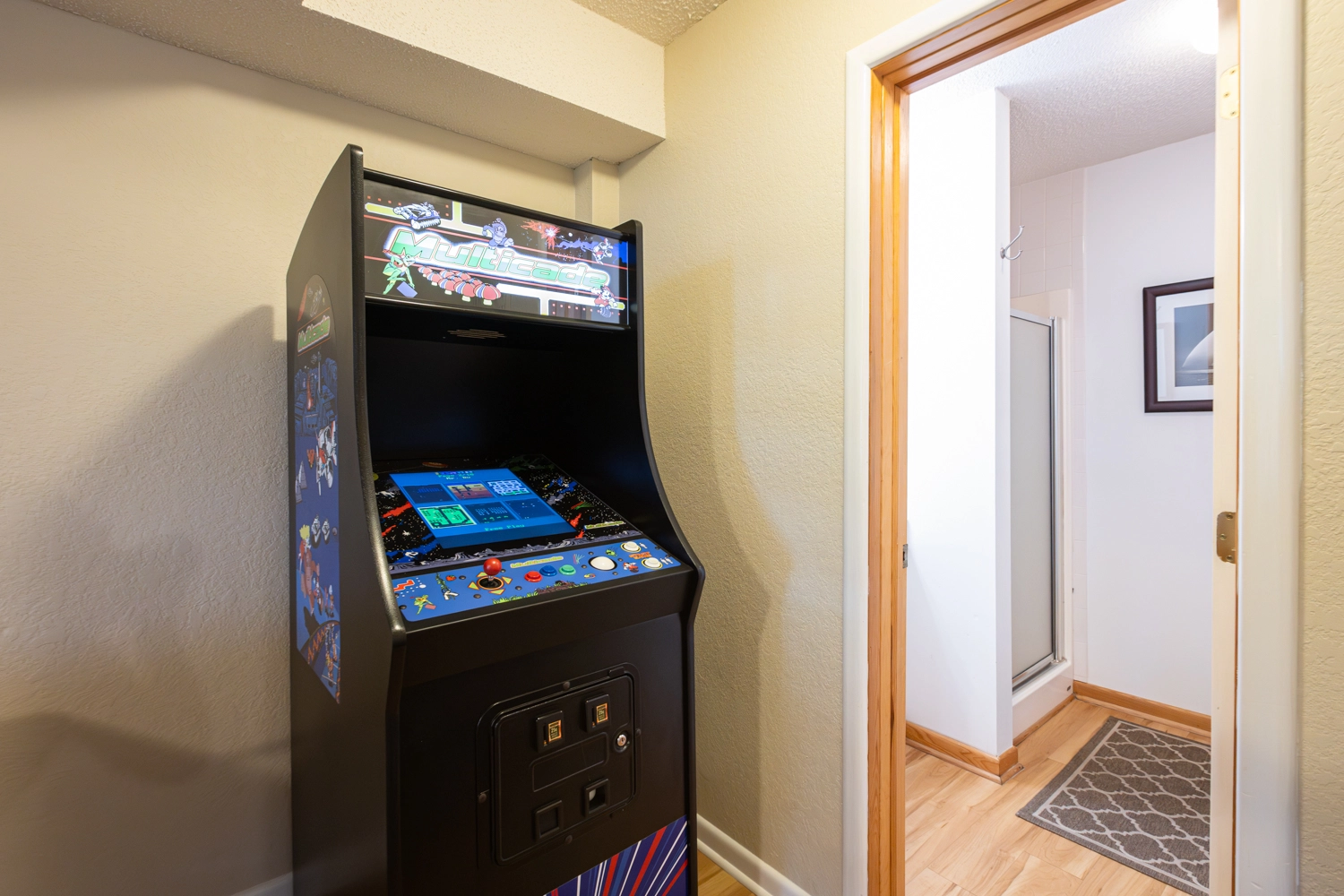 Rec room with 60 game arcade system, foosball and refrigerator; deck with pool and hot tub.