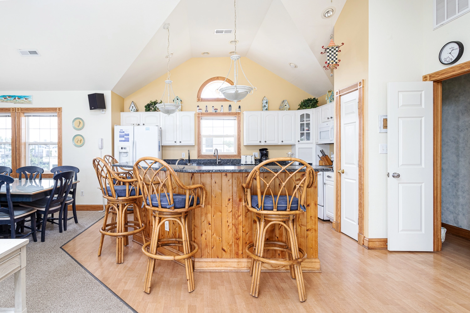Great room with home theater system; kitchen with two dishwashers and a wet bar; dining area; ship's watch seats four; screened porch and sun decks.