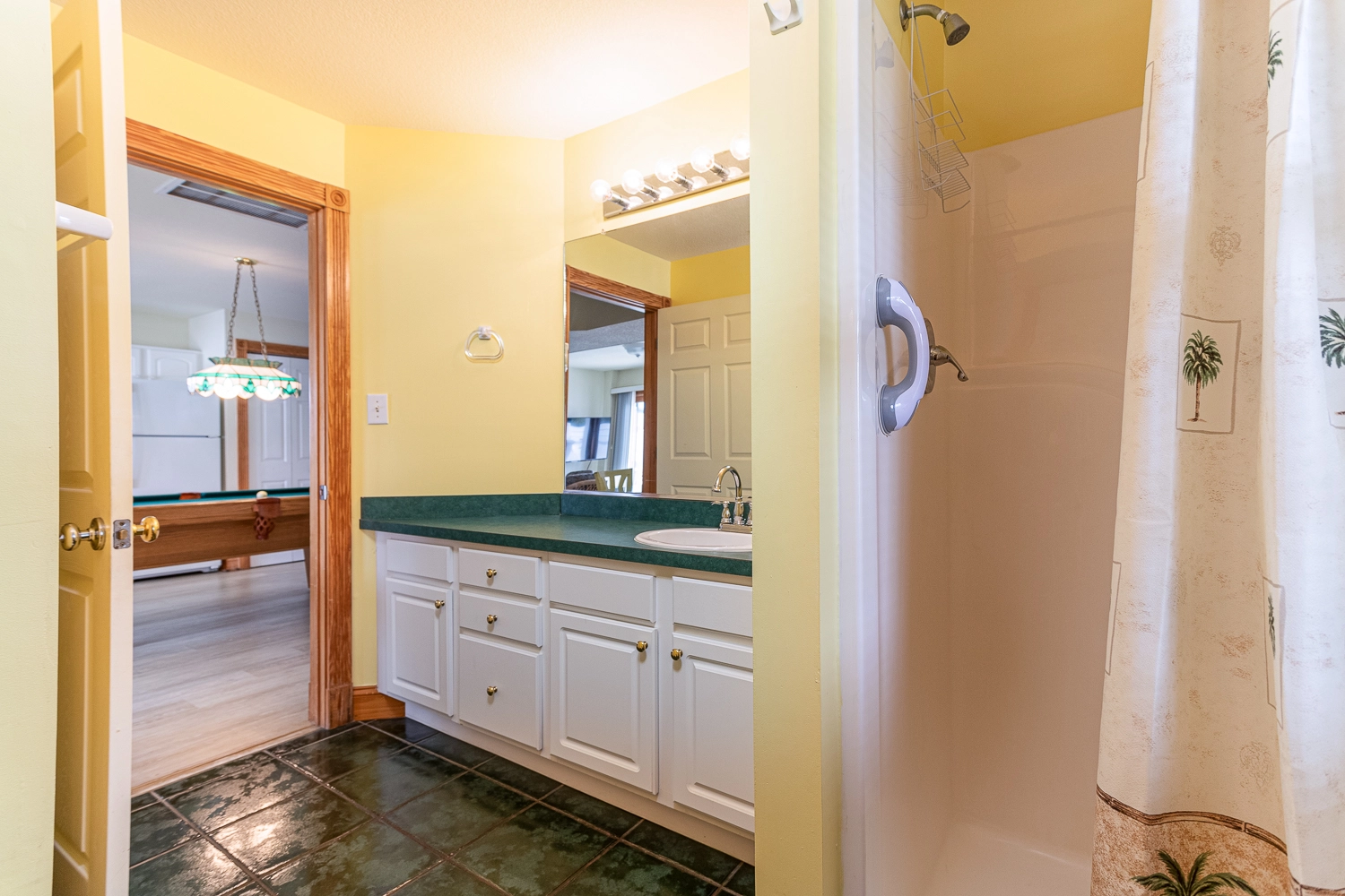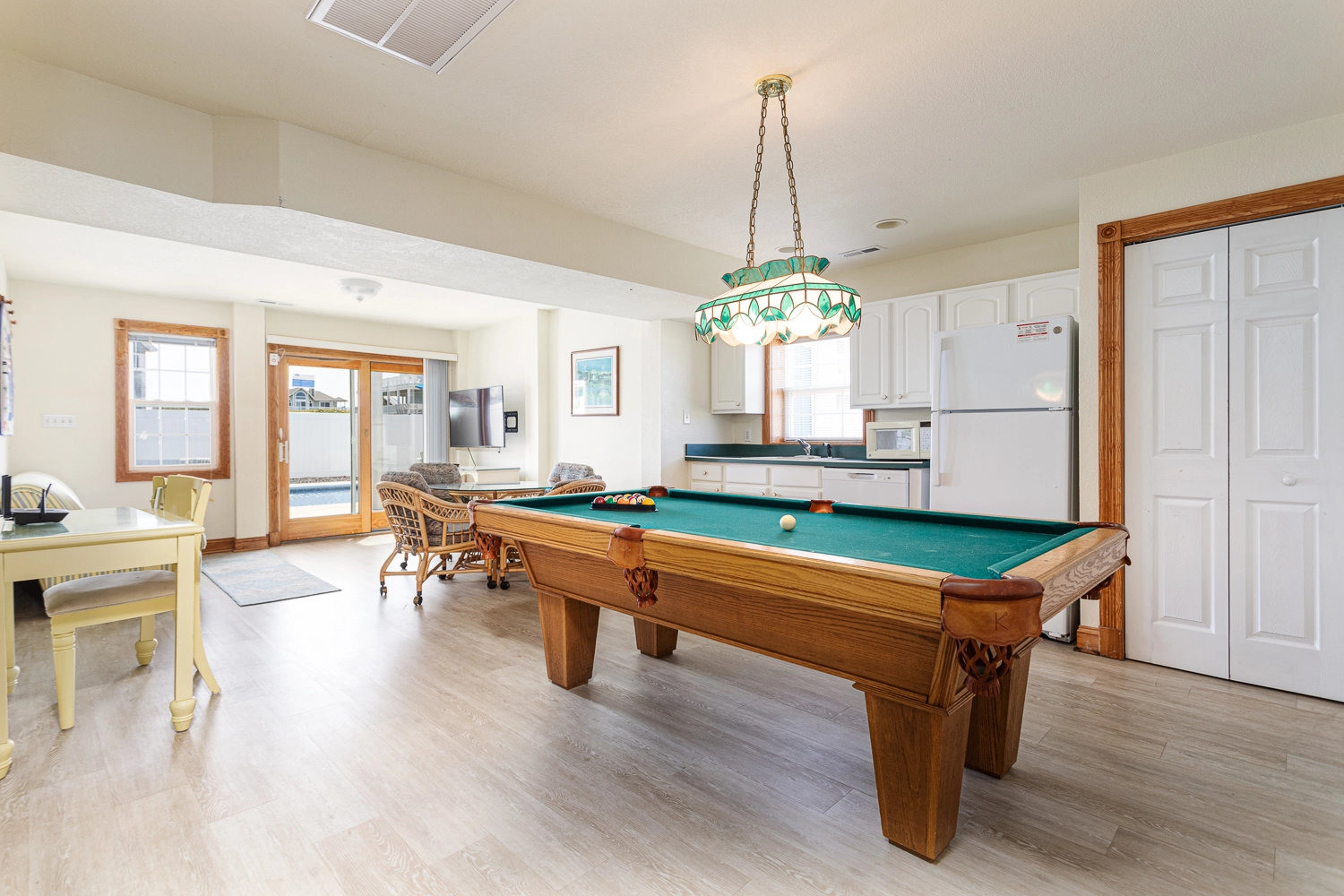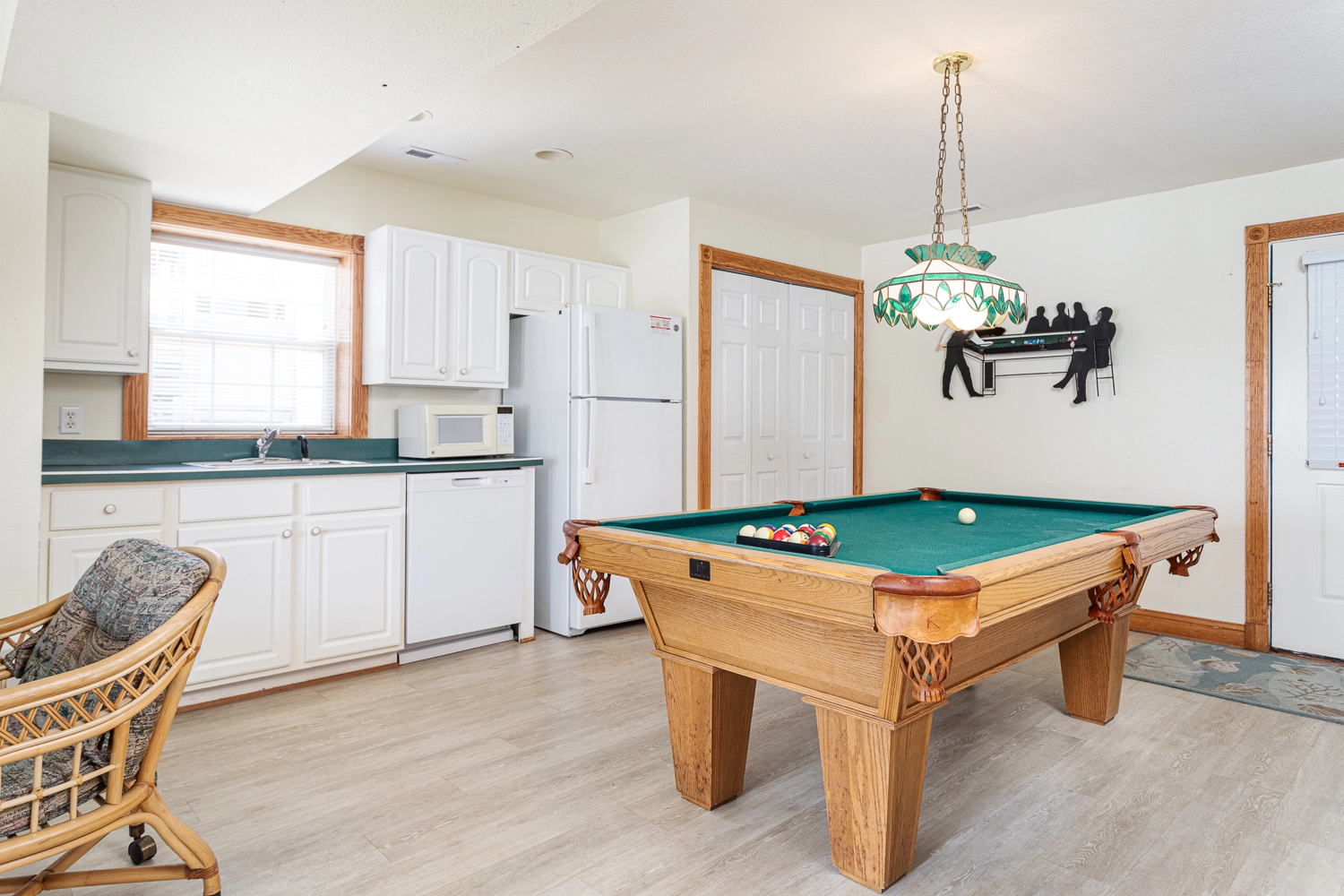 Rec room with entertainment center, pool table, card table and kitchenette with dishwasher; patio with pool and hot tub.