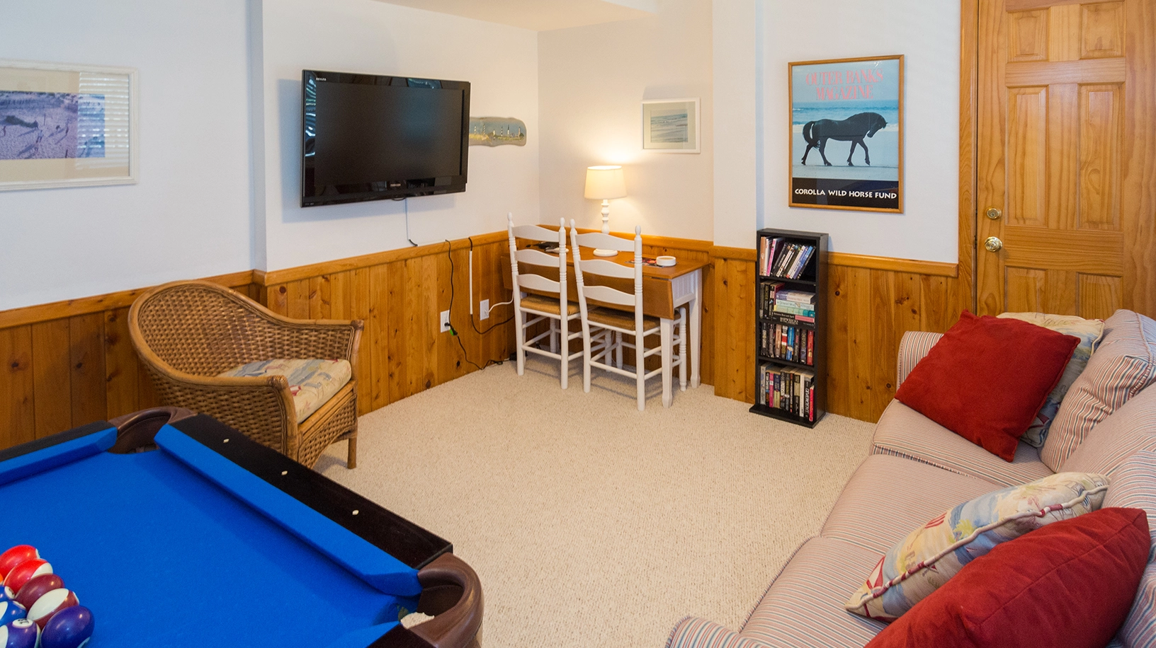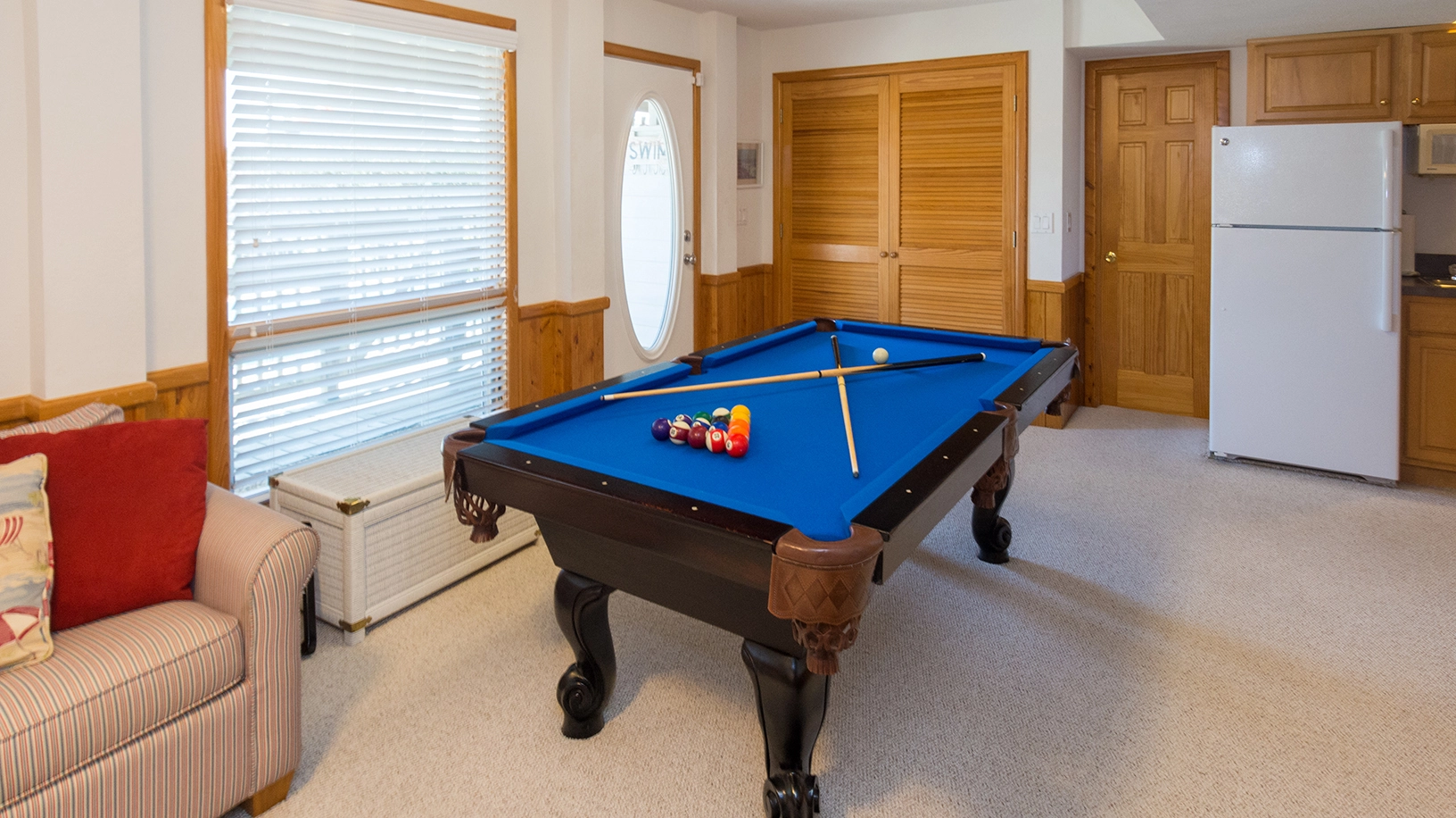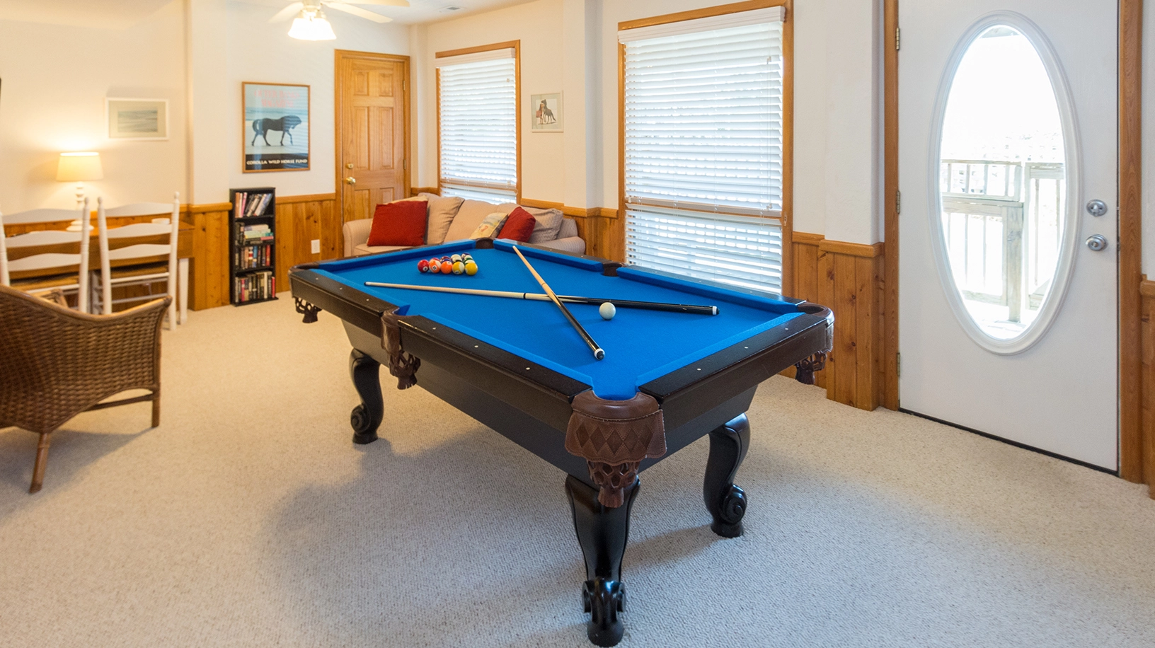 Gameroom (QSS) with pool table, seating and TV; kitchenette; gated pool.