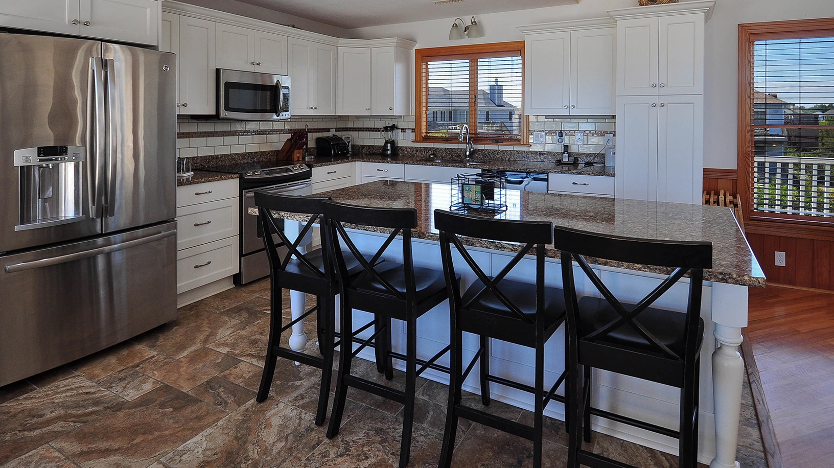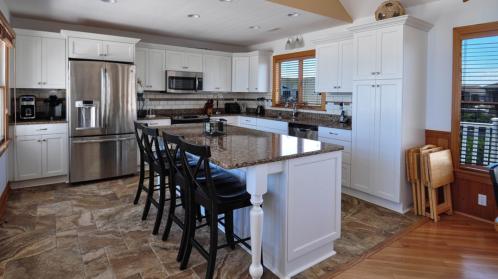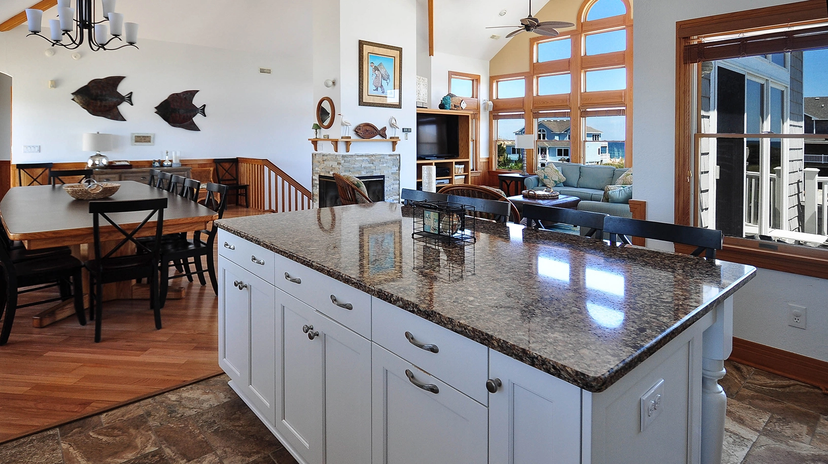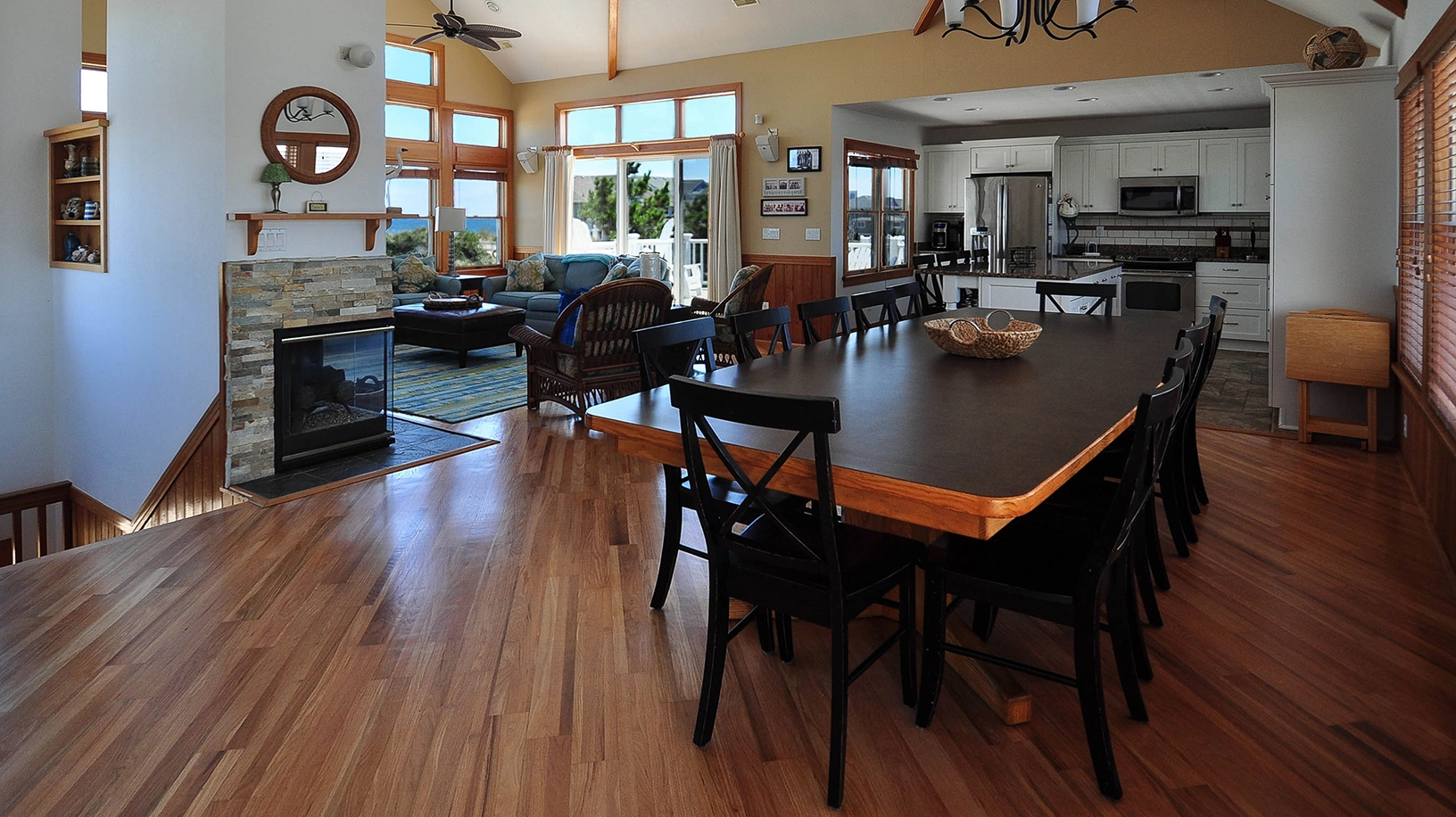 Great room with entertainment center; kitchen with island and 3 bar stools; 14-seat dining room table.