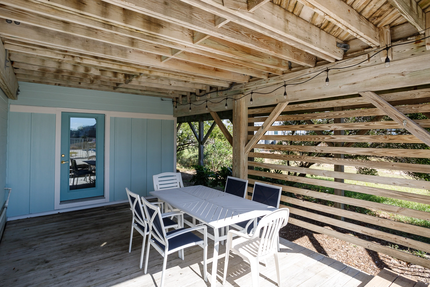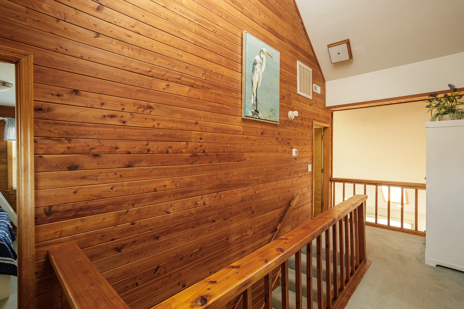 Dining area; kitchen; great room (down two steps); hot tub on deck.