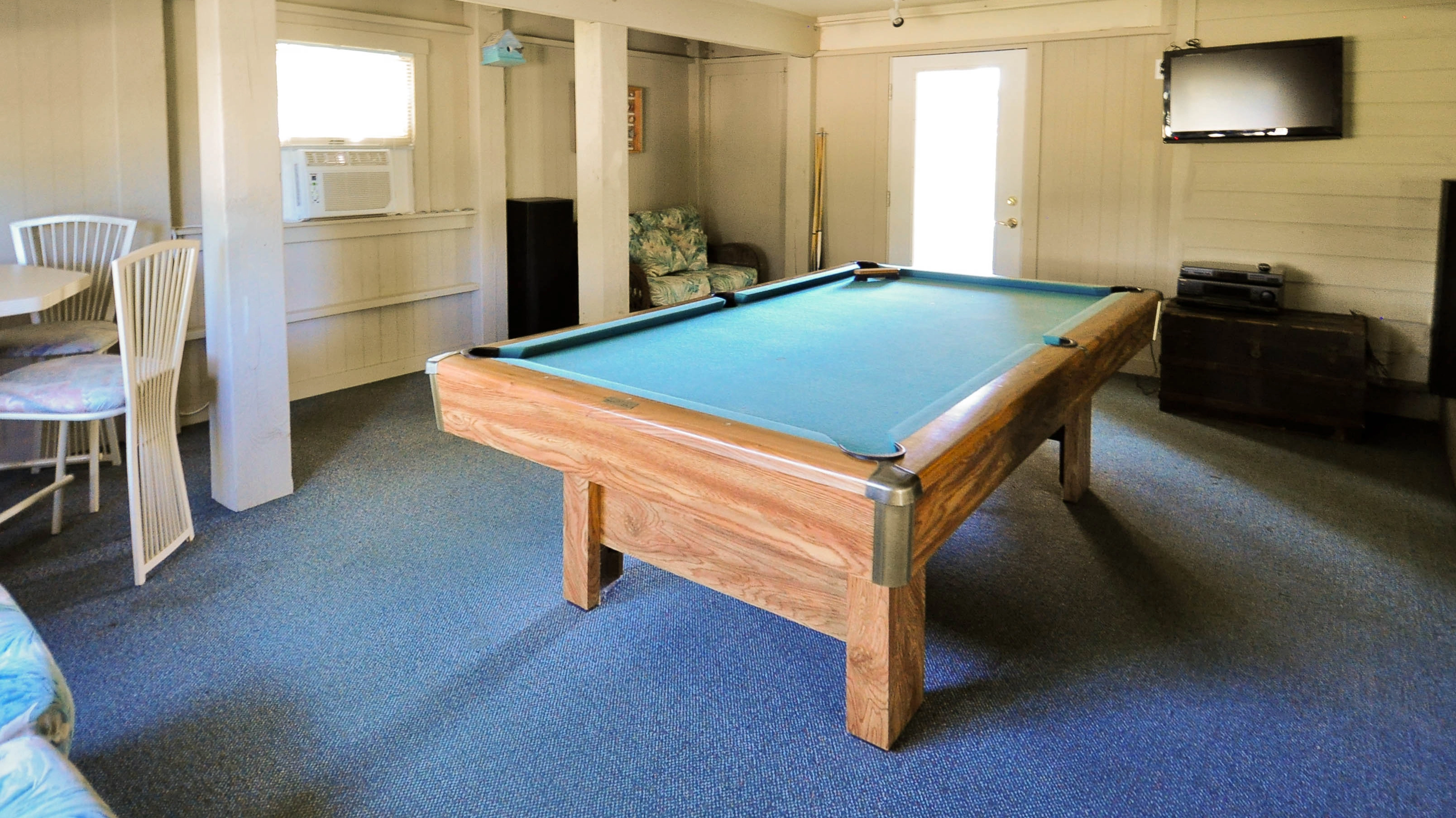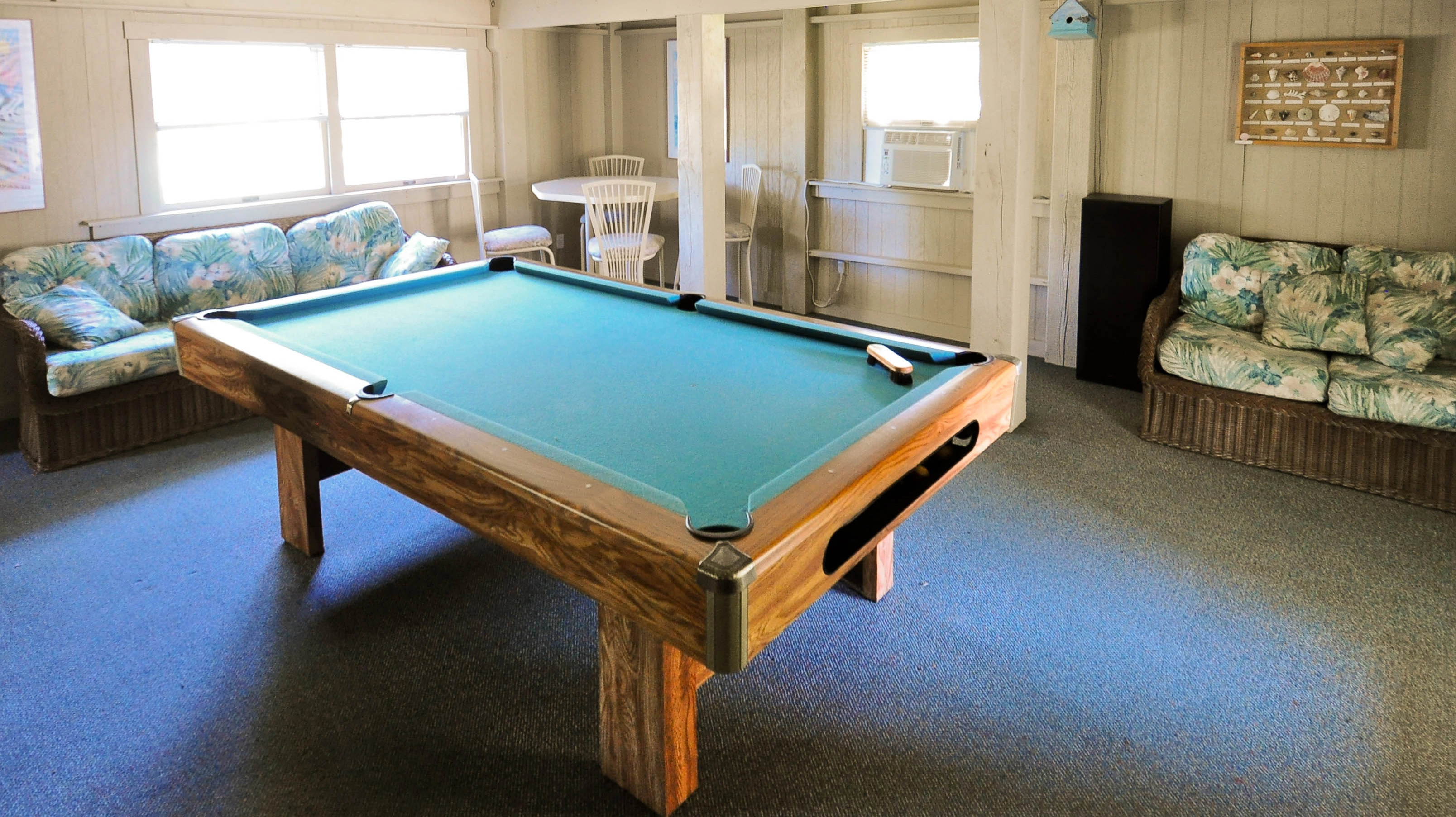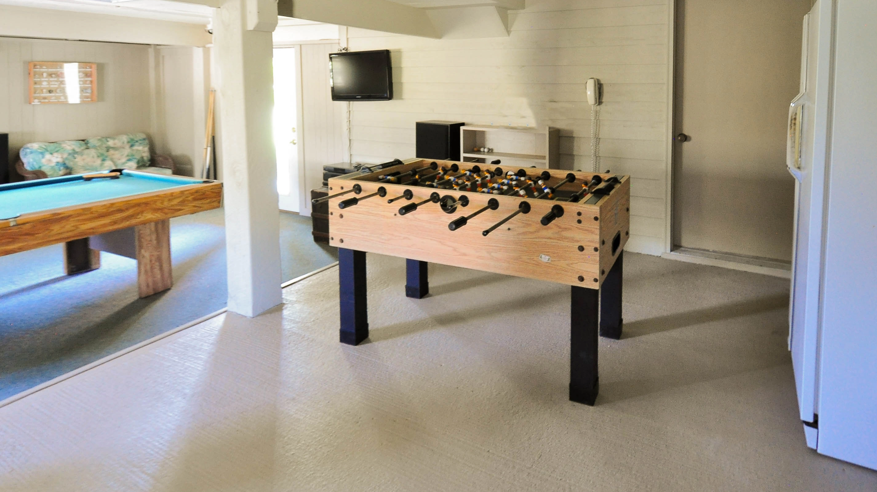 Rec room with pool table and foosball; access to gated private pool; outside entry.