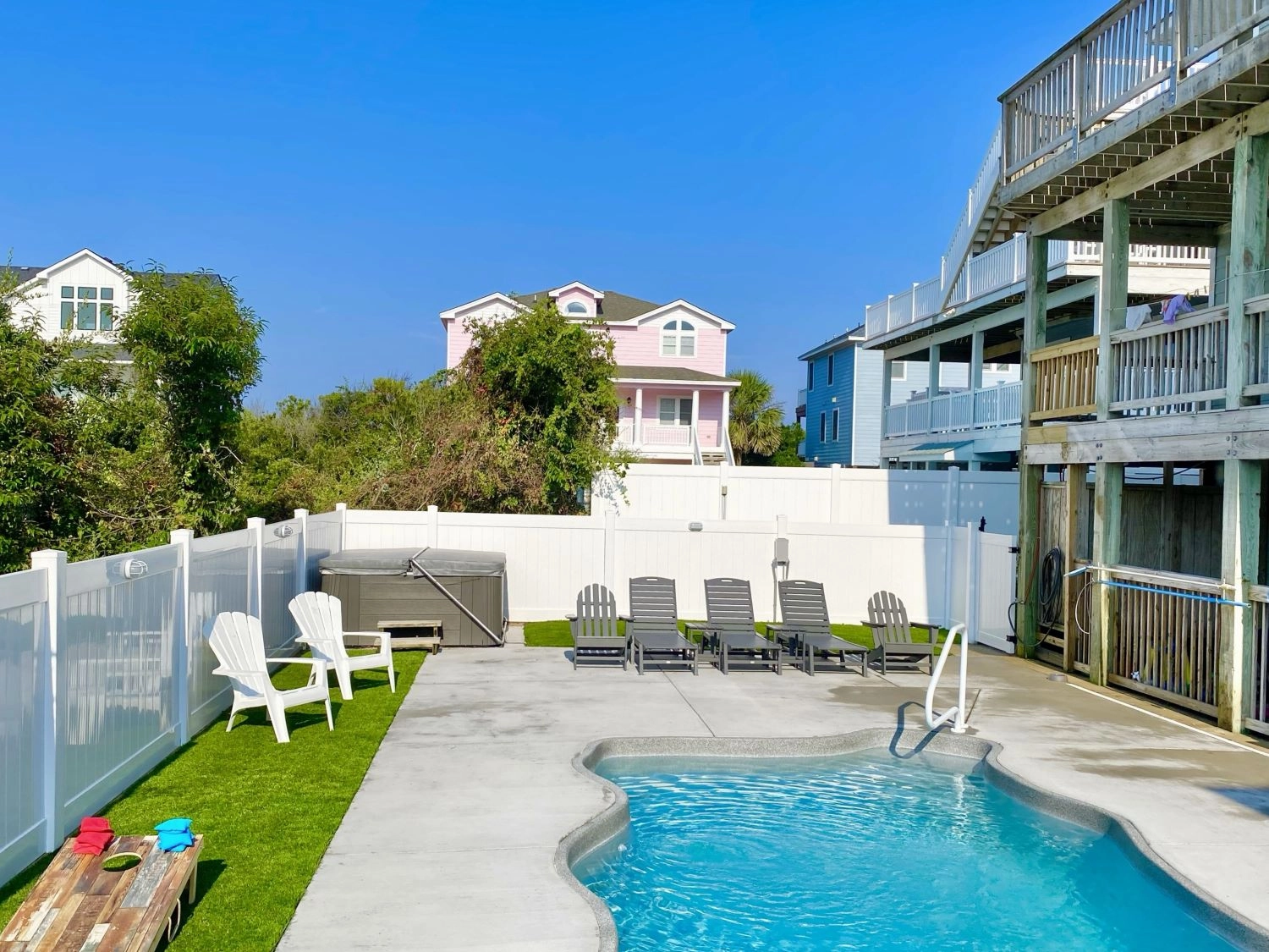 "We stayed in the Atlantic view in August 2024 with four families of four and had a lovely time. We love the location and easy access to the beach, which was one house away from the steps to the beach entrance. This made it very accessible to access the beach with all of our children and make several trips back-and-forth throughout the day and evening. The house itself was clean and well kept- the bedrooms were a decent size and all the children had plenty of their own space to sleep and all adults had a private bathroom. No complaints about the pool and Spa as we were concerned at first that the pool was too small to accommodate all of our families, but it ended up working out just fine and the spa was well-maintained and enjoyable. We were impressed with the owners attention to the renters and the little token of appreciation they sent us a few days into our trip. There were a few things that could have made the house better such as some extra touches on the balconies like an outside dining table and hammocks to sit in since you can hear the ocean nearby. A Pac Man machine, a wet bar in the basement, and a tiki bar outside would have made it perfection and I think these are some small improvements that the owners can improve on with time."