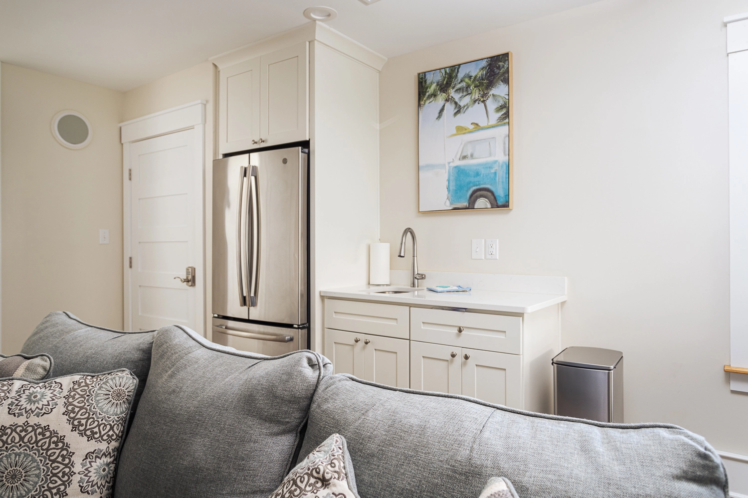 Sitting area with foosball, wet bar, and refrigerator; laundry with two washers and two dryers.