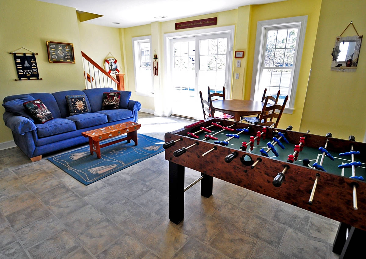 Rec room with foosball and wet bar.