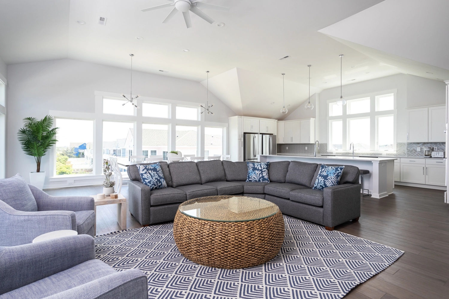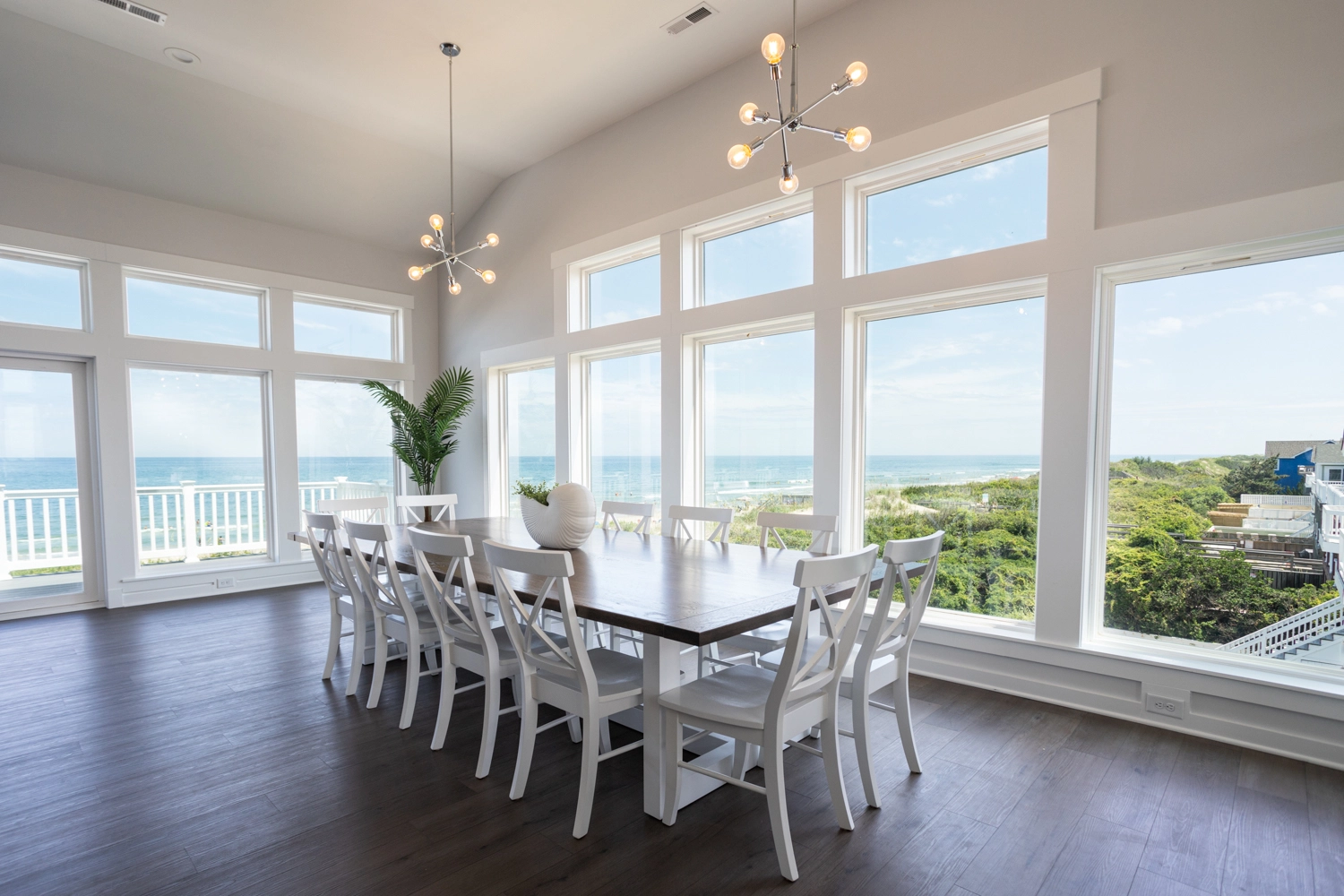 "The home was spacious. It fit our extended family- 6 families together. We did not feel crowded and it was so nice that the adults were able to have their own master bathroom. The kitchen was stocked with everything we needed to cook through out the week. The island and dining room table fit everyone!! The decks overlooking the ocean were dreamy and the view from the third floor is jaw dropping!"
