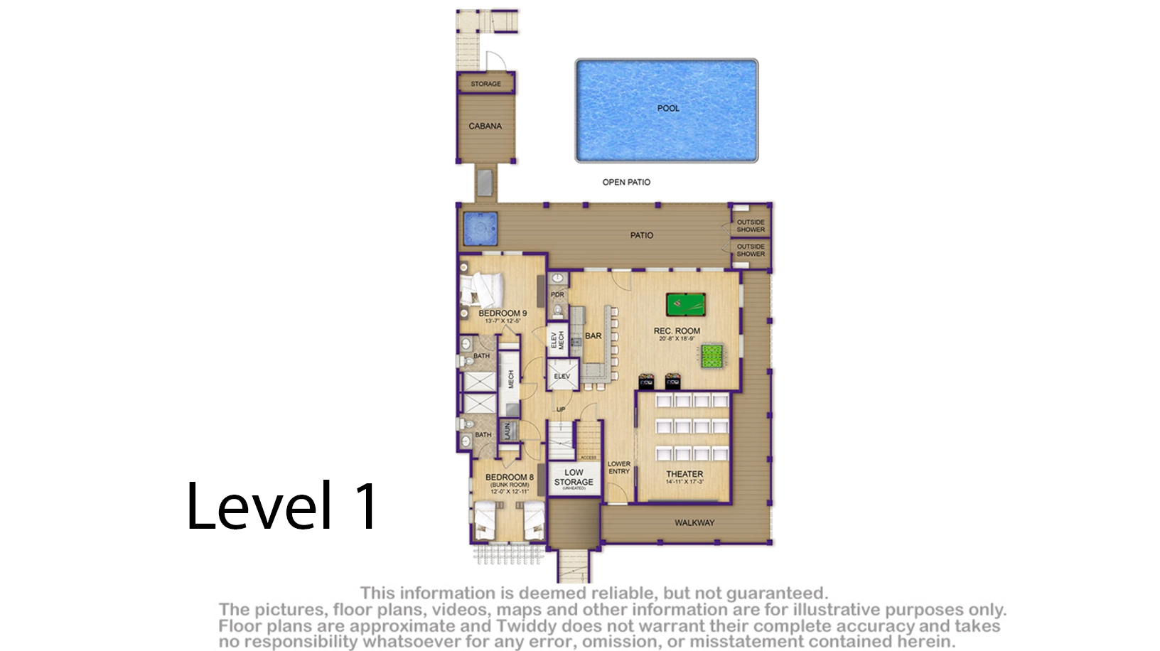 Rec room with pool table and bar; theater room. Laundry.