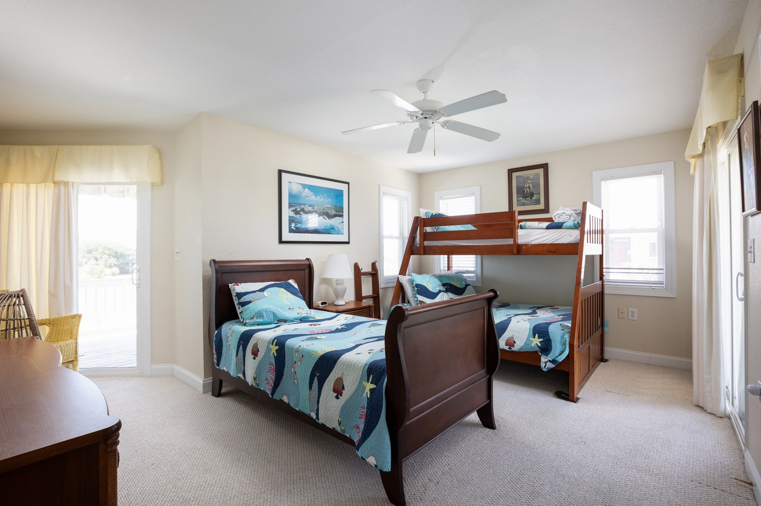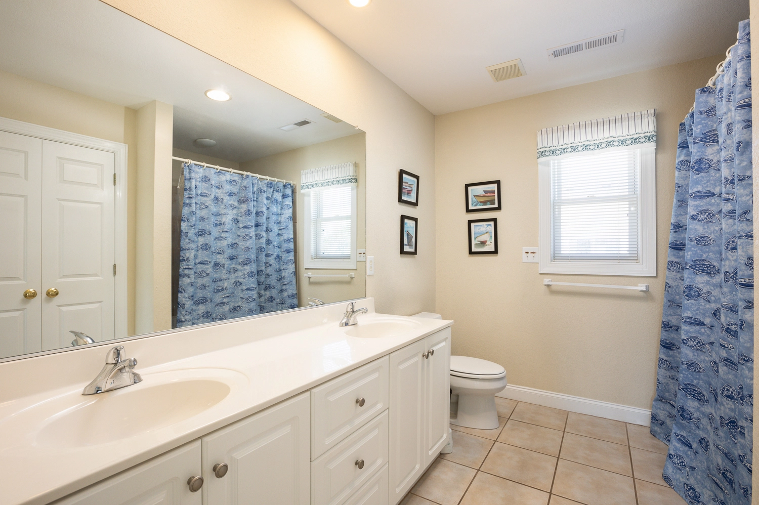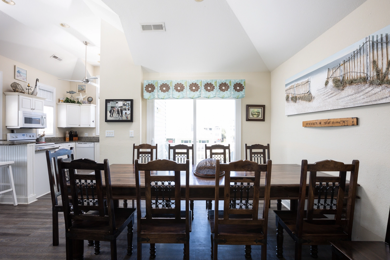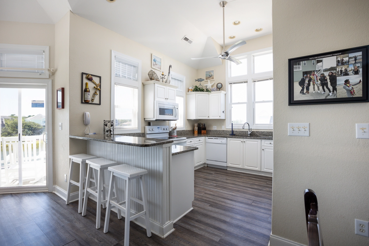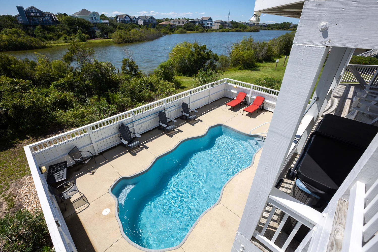 "Lakeside Breeze was a lovely home on a number of different fronts. Our group enjoyed the interesting interior spiral layout, the size of the rooms, the appointments of the interior, and since we cook every meal for our trip, we found the kitchen and dining areas to comfortably accommodate a group or eight adults. The true selling point to the home though in my opinion is the beautiful lake directly adjacent to the home. Our trip had windy conditions that kept us from the beach for a couple days so we camped out by the very nice pool area, and had that enjoyment enriched by the beautiful lakefront environs. A couple of folks in our group brought their dogs down and the lake area became a park like path for them to be able to comfortably and easily walk their dogs around a medium sized (about a half mile circuit) nature preserve, complete with turtles, fish, and even an egret that we got to watch from the back porch. And speaking of, watching the sunset from the back porch of the home over the lake area was a real treat. I'd never thought having a lake front would become a requisite at a beach house, but that now does seem to be the case. Aside from the gushing, details for future pragmatic families staying at Lakeside Breeze should know the home is fully functional for two cooks in the kitchen working on any given evening, the beach is about 1000ft or a five minute walk. For elderly members in your party know that there are some potentially formidable stairs required to cross the dune onto the beach. Additionally for eight adults some rooms are more child oriented so a couple adult folks made do in smaller bunk sized sleeping situations, which worked out fine for our party. Overall, we really enjoyed the unexpected utility of the lake for walking, socializing, and dog related stuff. The home itself was a really good fit for us, and the service from Twiddy was also very timely, friendly, and attentive. The house might work better for a smaller group than ours or one with kids, but this home was terrific for our group of eight adults and we look forward to a future stay. Thanks guys!"