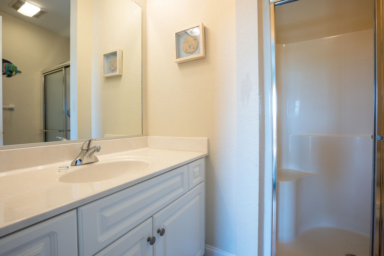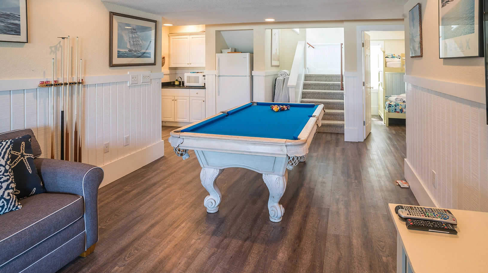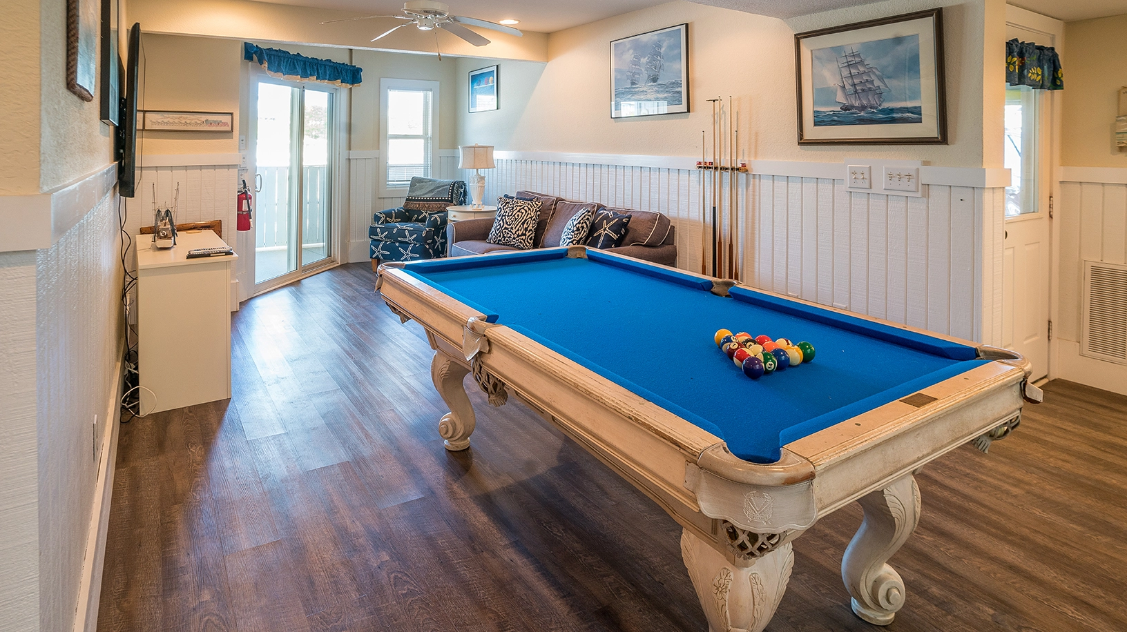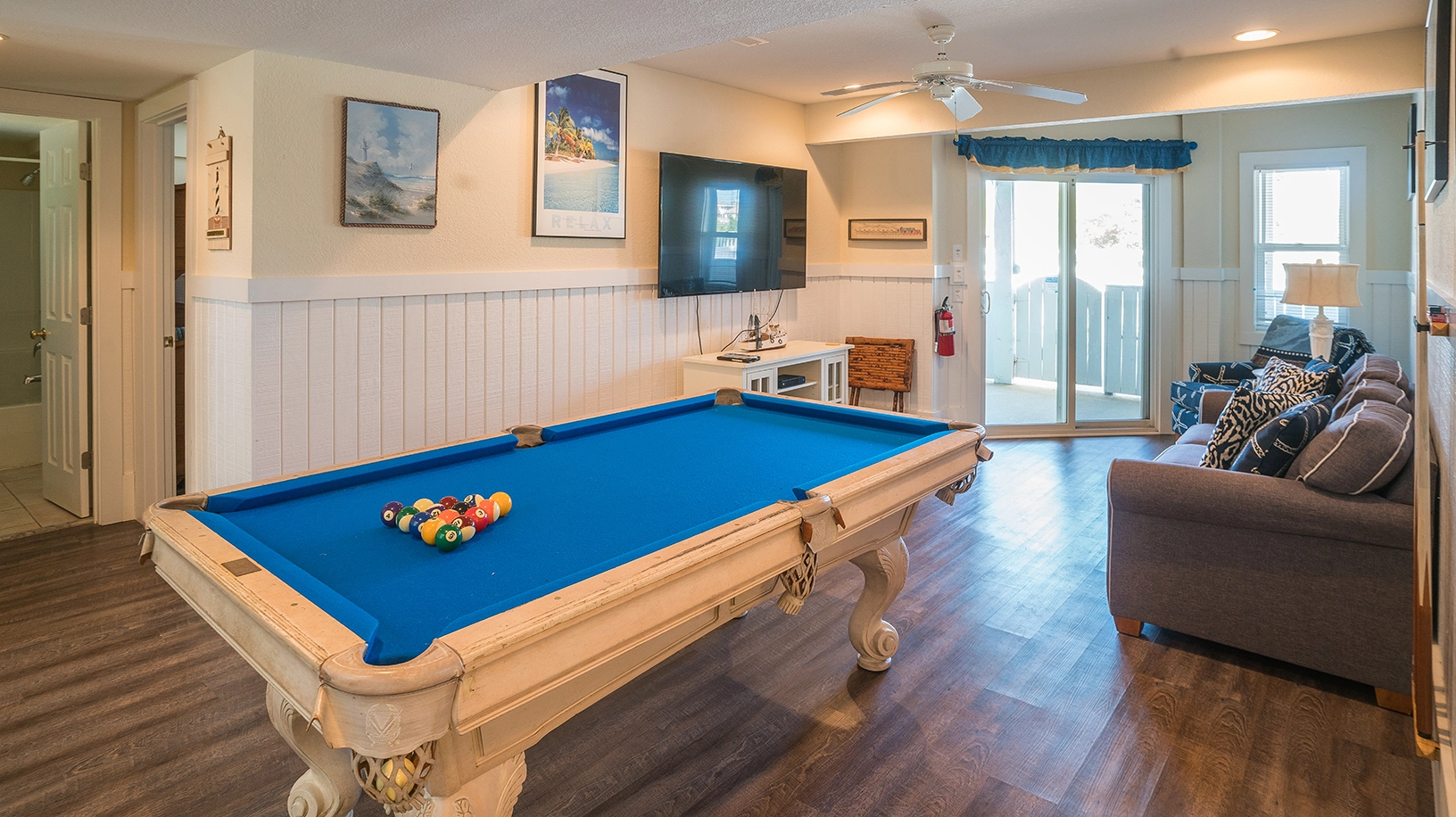 Gameroom (QSS) with refrigerator, microwave and pool table; full bath; laundry; carport; two outdoor showers.