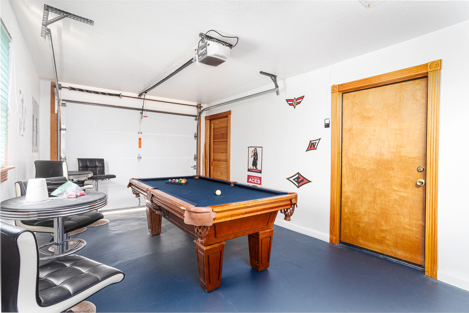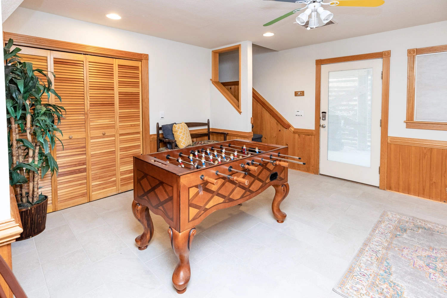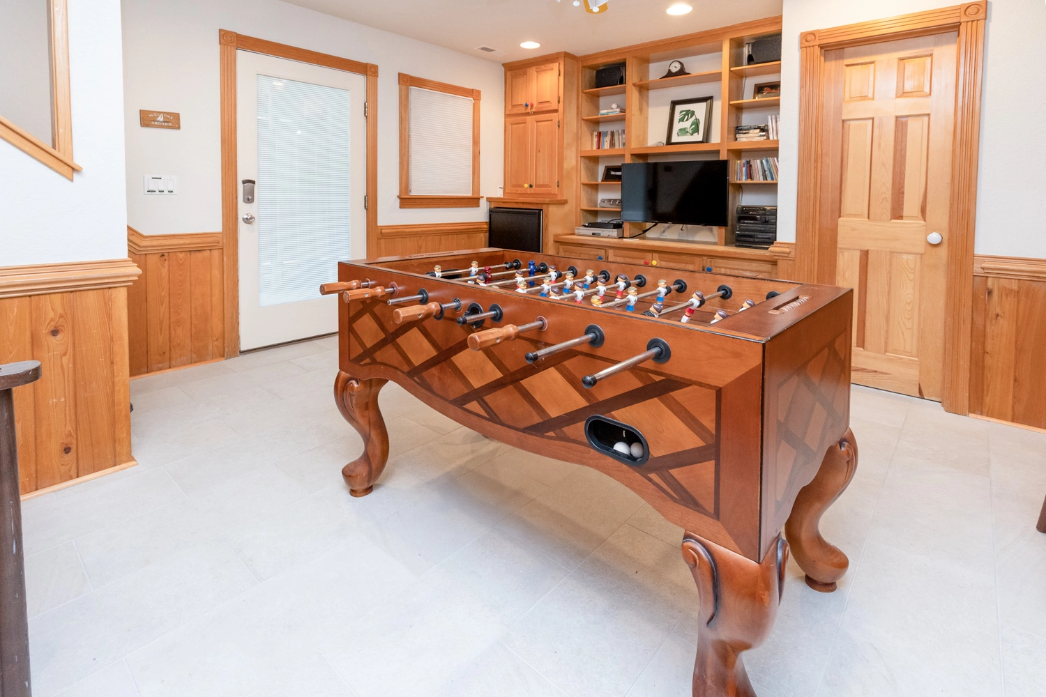 Gameroom with foosball, entertainment center and refrigerator; laundry; garage with pool table; outside tiki bar with L-shaped ceramic bar, fan, and adjoining grilling area.