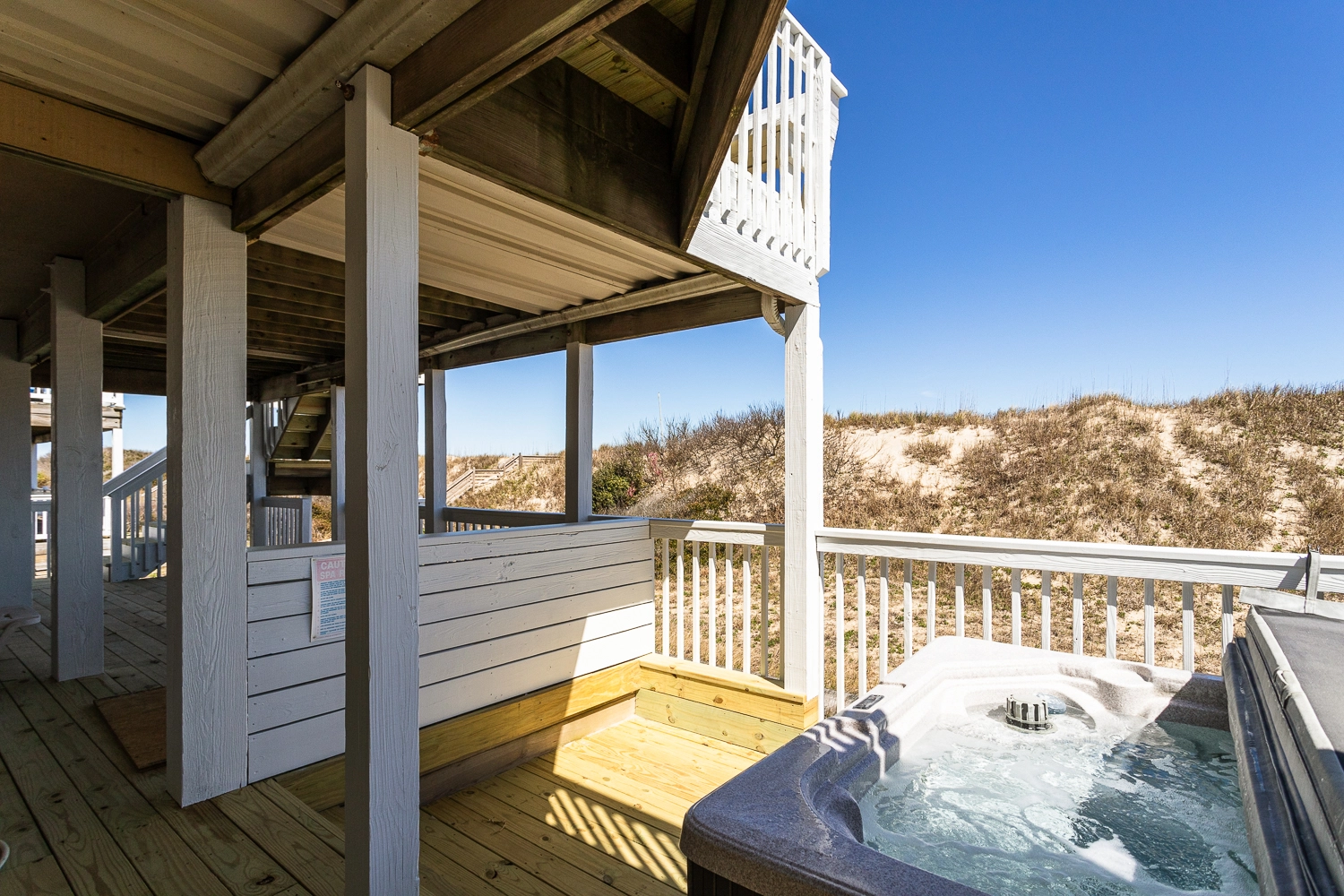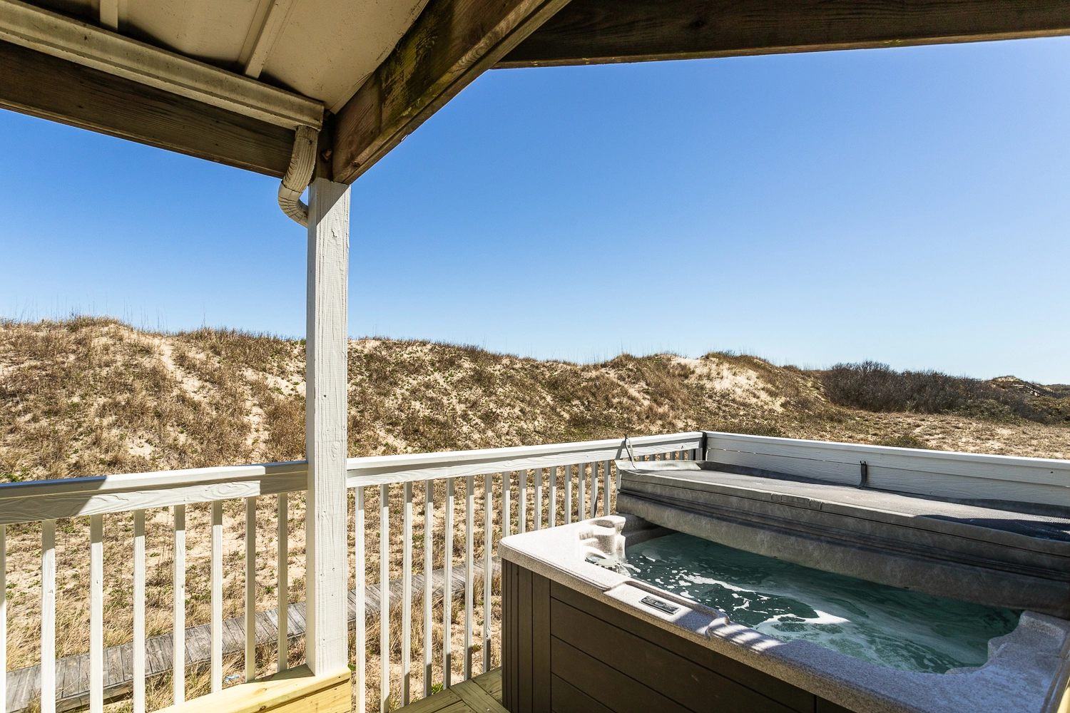 Covered deck with separate hot tub area that's opened for starlight dipping.