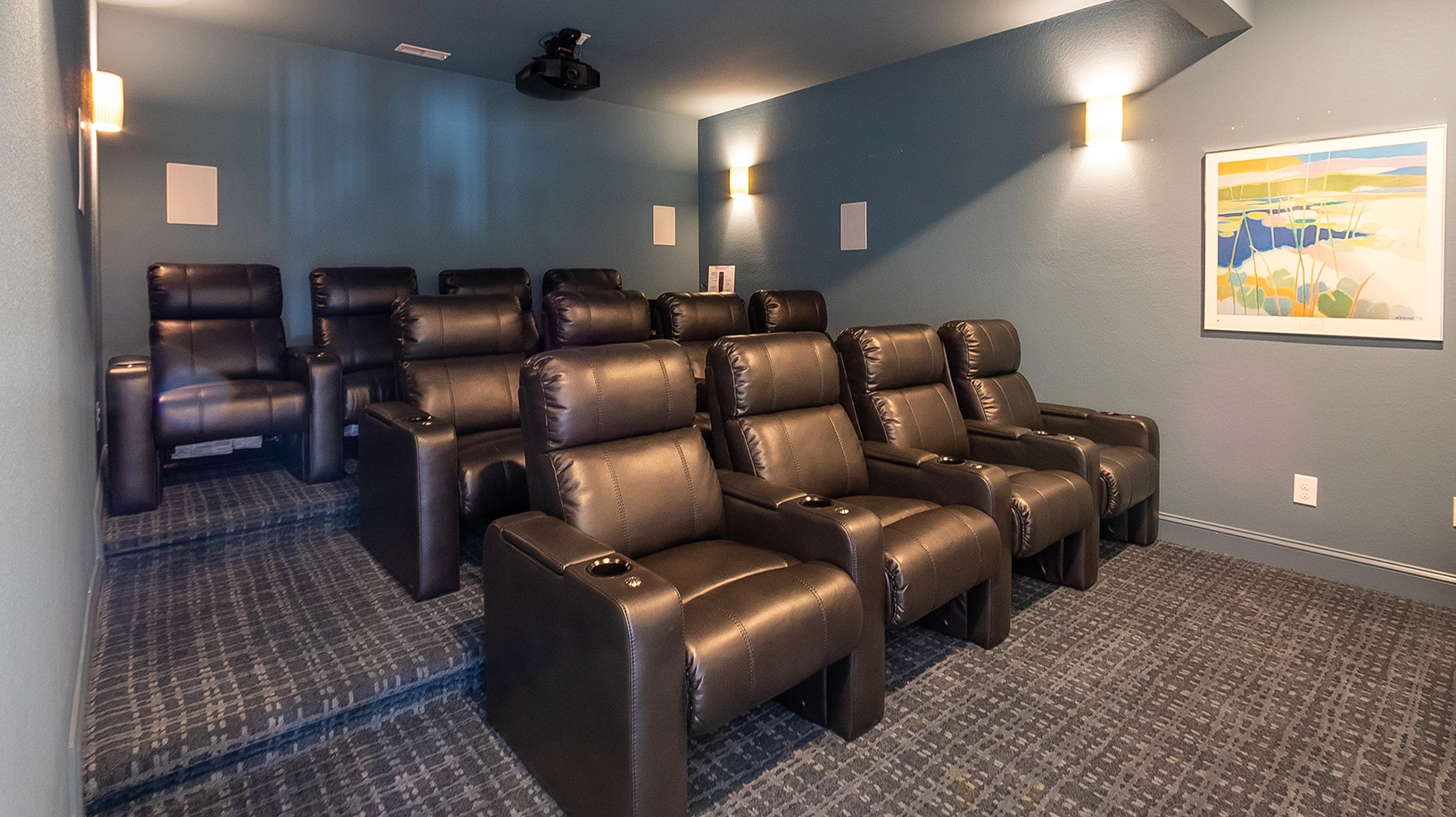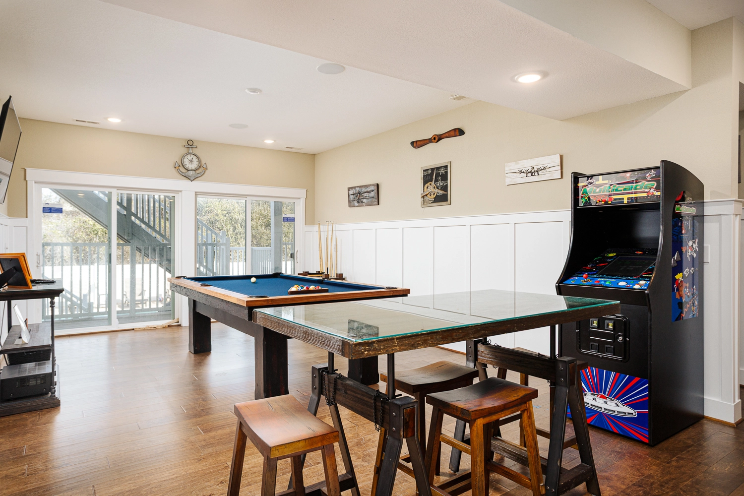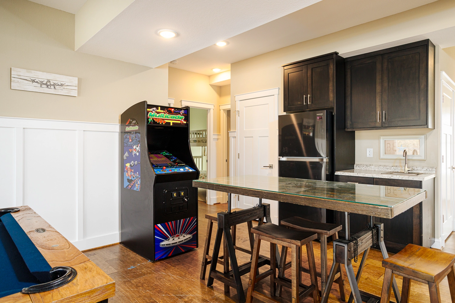 Rec room with wet bar and Arcade Classics Full-Size Upright Multicade; theatre.