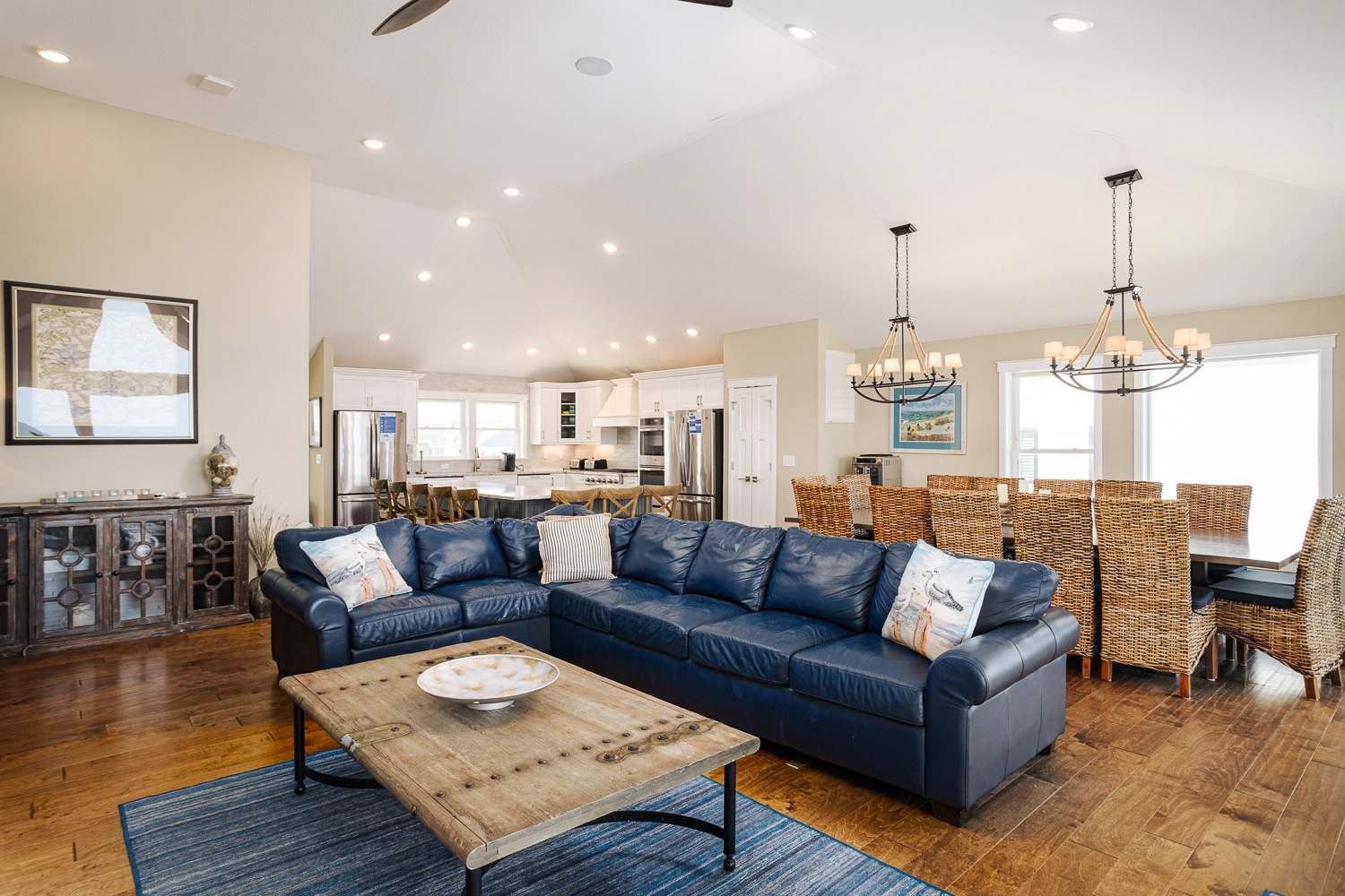 Great room with gas fireplace; kitchen; dining area.