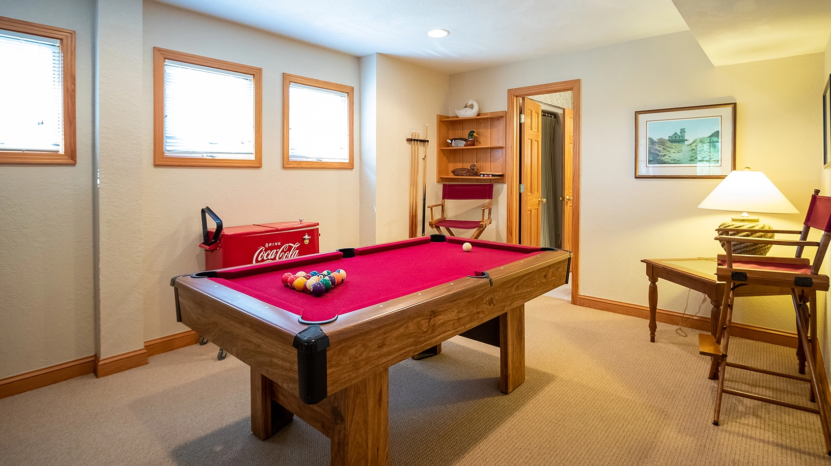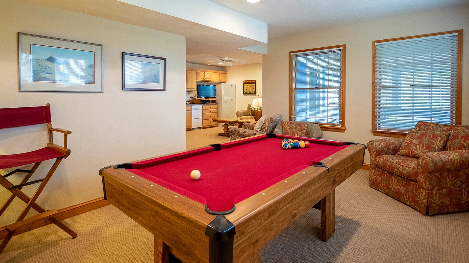 Rec room with pool table, sink, dishwasher and refrigerator.
