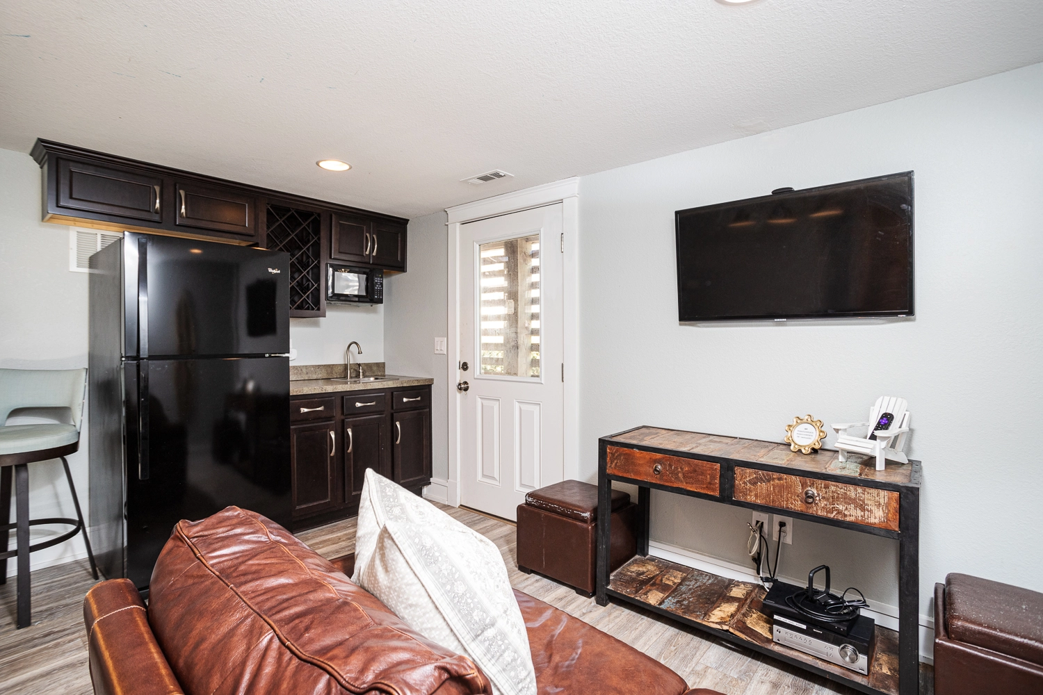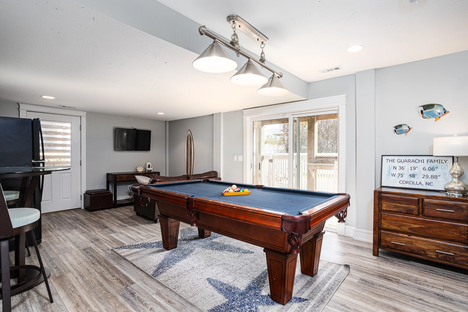 Rec room with pool table and wet bar with refrigerator.
