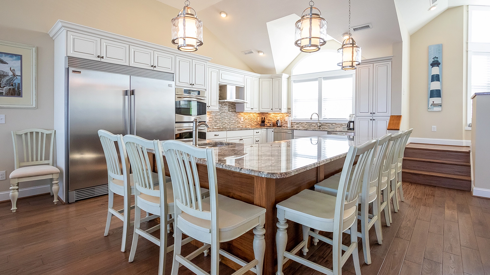 "This was our 3rd stay in a Twiddy home in the last 4 years. All homes have been wonderful, but this was home was certainly the nicest. The finishes were great, the floor plan/bedroom layout was great (3 families gathered together on this trip with 6 kids ranging from 1 yo to 13 yo), and the amenities were well used (theater room, pool table has ping pong and air hockey conversions, and the heated pool was excellent, and the elevator came in handy with groceries). The only minor drawback was not having a baby gate at the top of the stairs on the 3rd floor. We are used to the homes we have stayed in previously having one installed, which is a great feature. We had a 1yo on this trip so we had to block the stairs using dining room chairs. Not major at all, but would be nice to have one installed or available for families with young children."