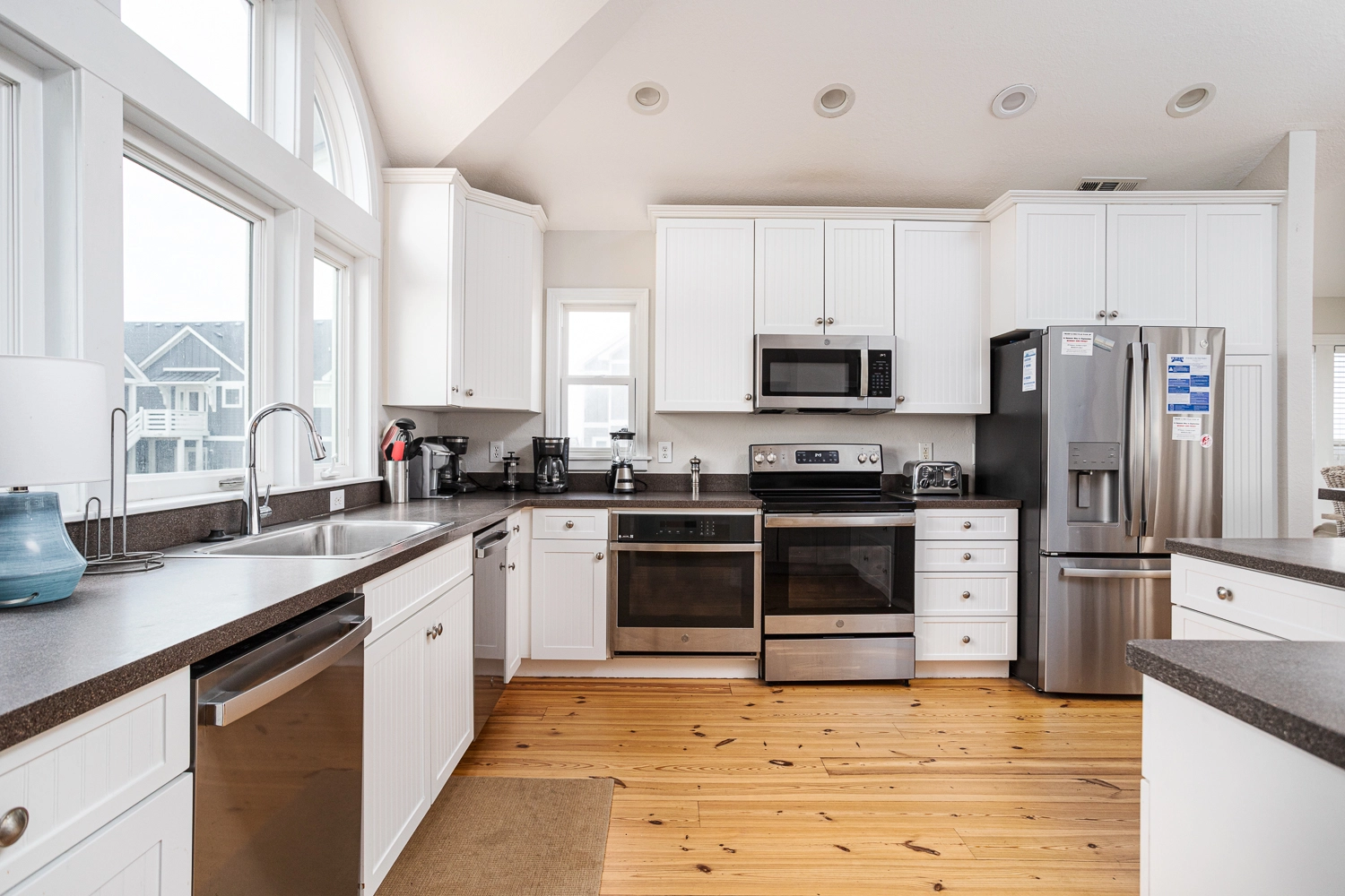 "It was close to the beach and had plenty of bedrooms and bathrooms. I liked that each bedroom had its own bathroom. The kitchen was well stocked and the stove and ovens seemed to work well. Loved the 2 big refrigerators in the kitchen and the extra one on the first floor. We filled all of them! We also were grateful for the two laundry rooms!"