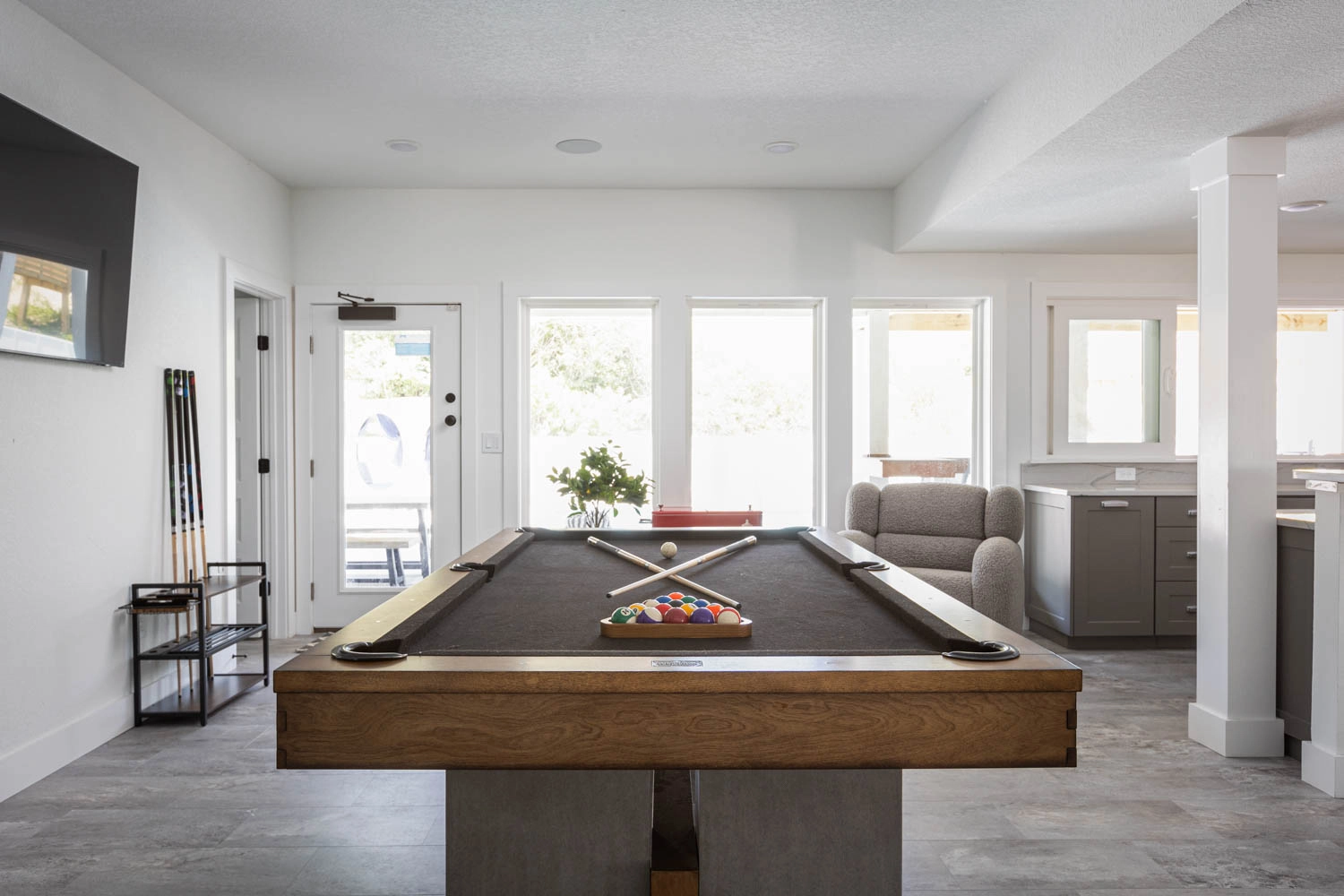 Theatre room; rec room with pool table, arcade game, and kitchenette with refrigerator and bar.