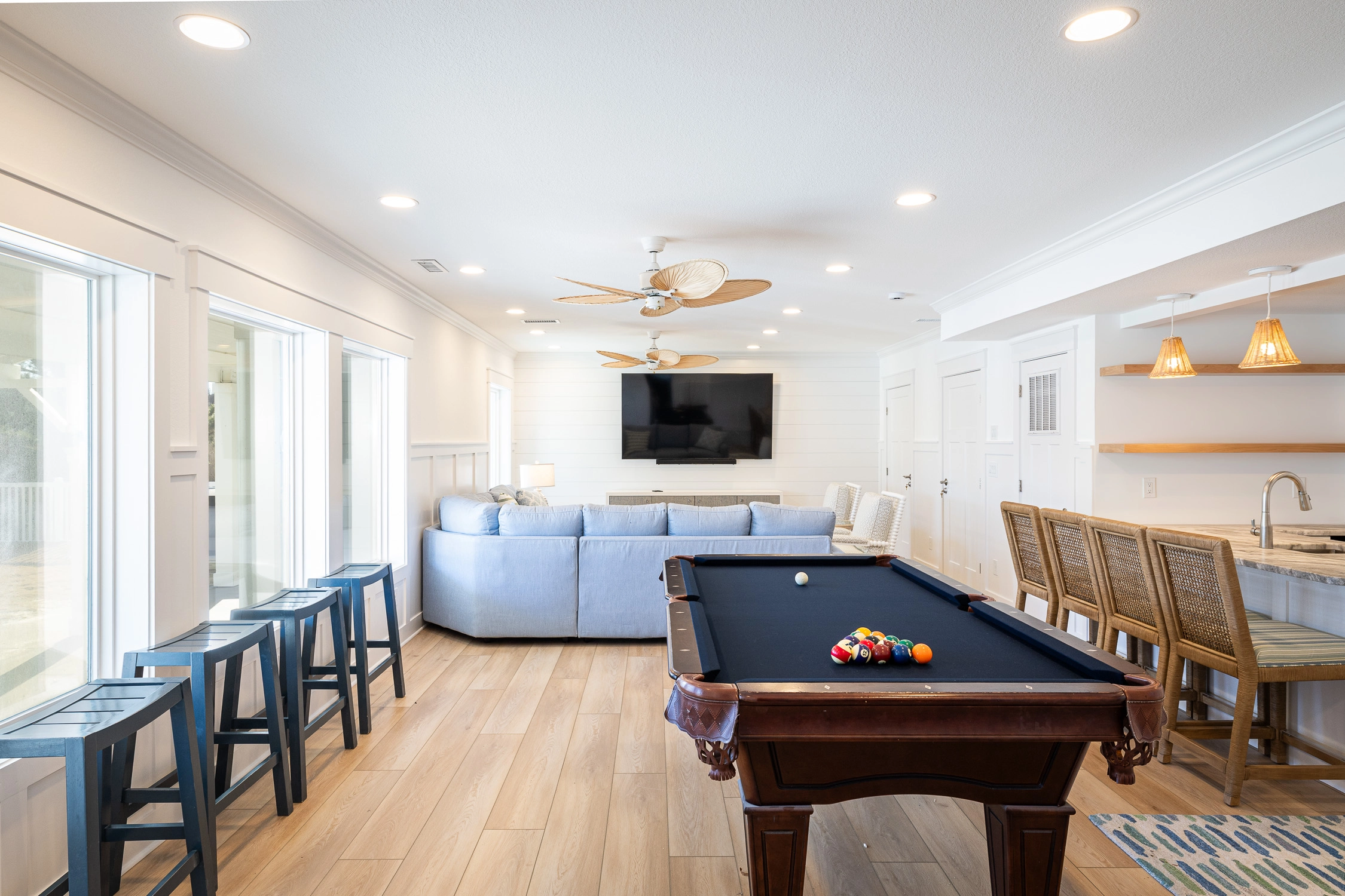 Media room with a large screen TV, seating, bar area, pool table and shuffleboard table.