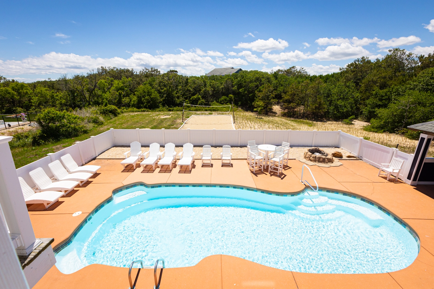 Elevator, heated private pool, poolside cabana, hot tub, gas grill, volleyball court.