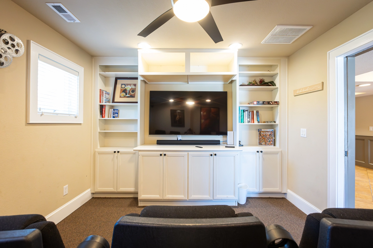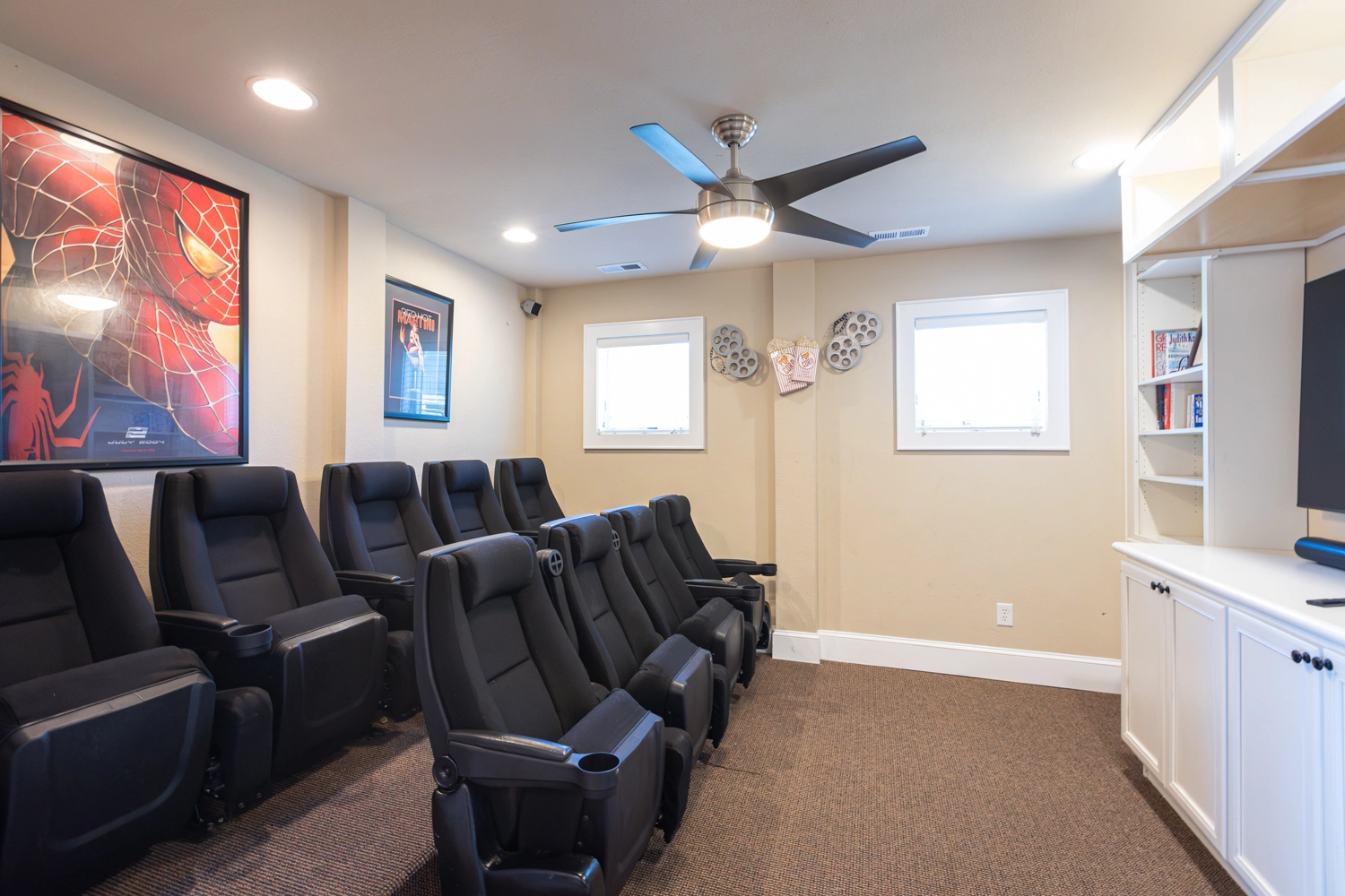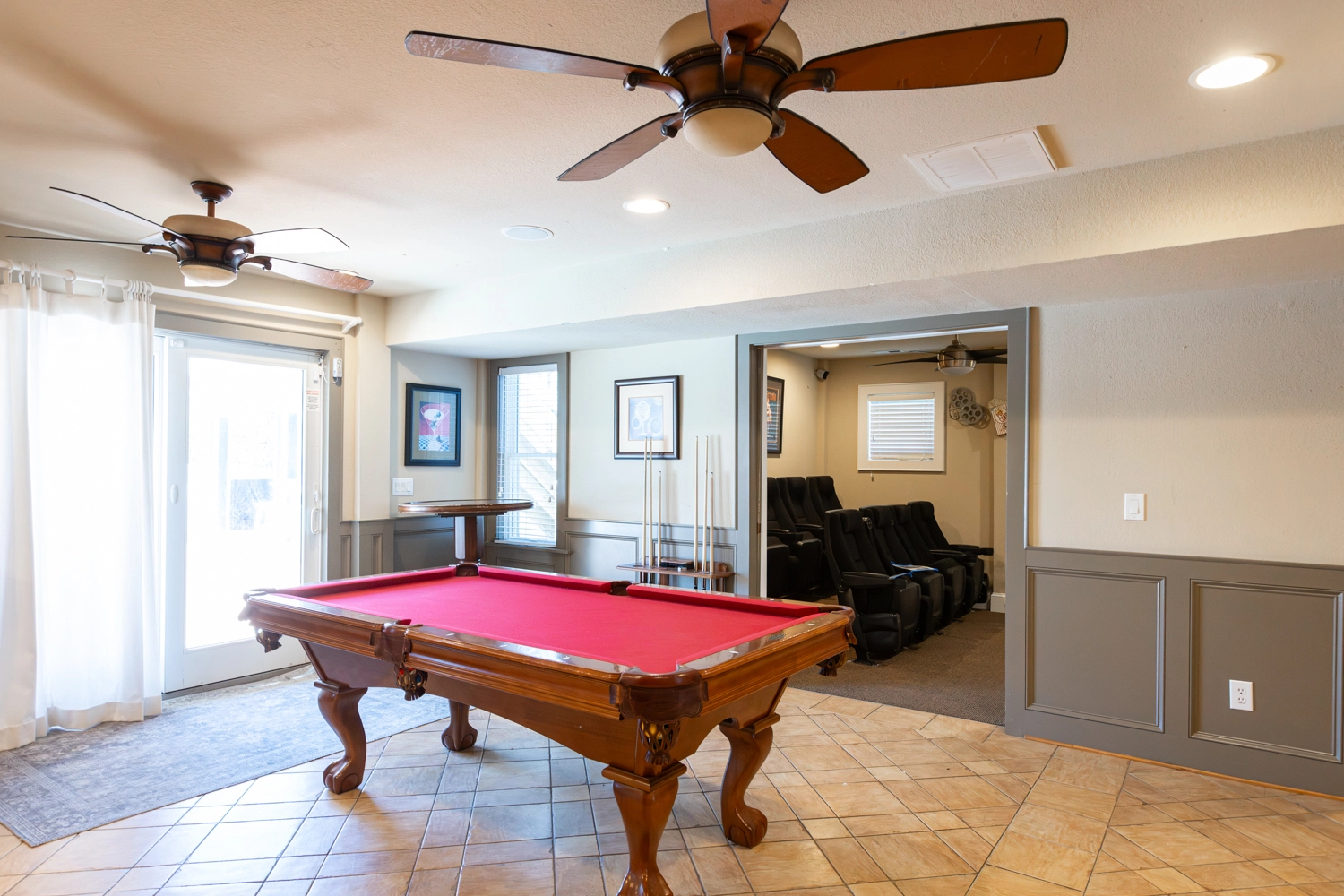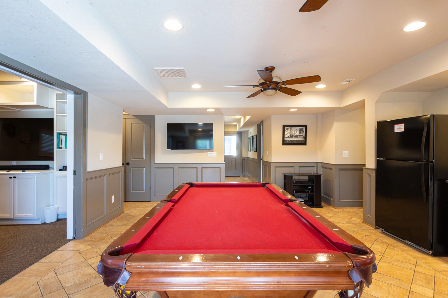 Theater room; rec room with pool table and wet bar with refrigerator; laundry.