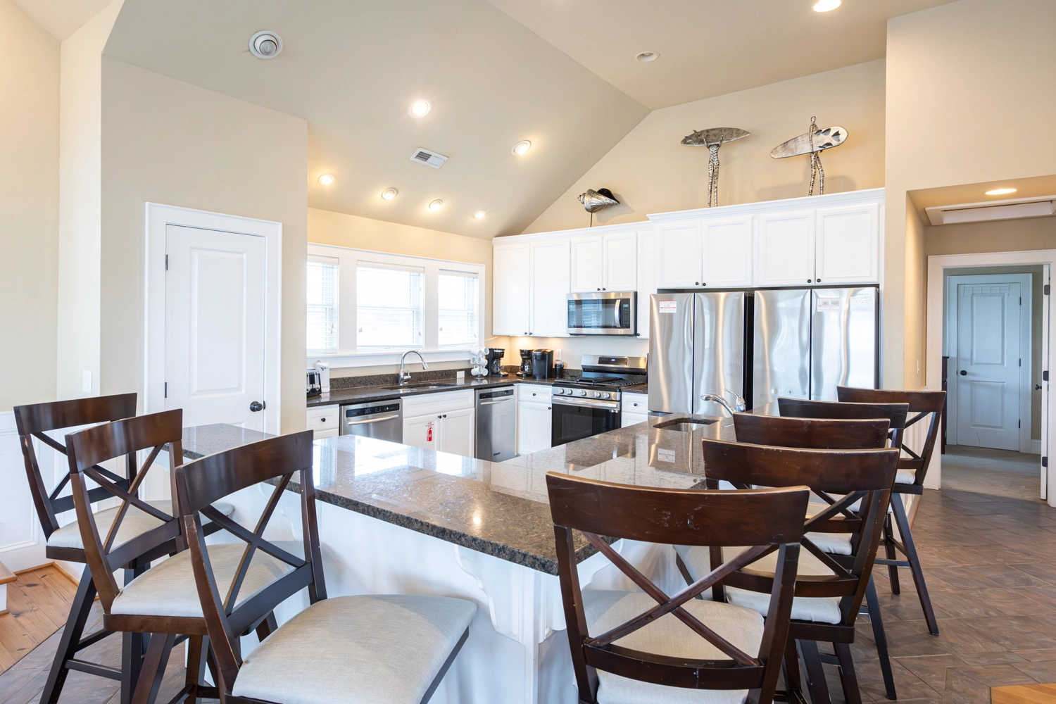 Great room with gas fireplace; kitchen with gas stove, two refrigerators, and two dishwashers; dining area.