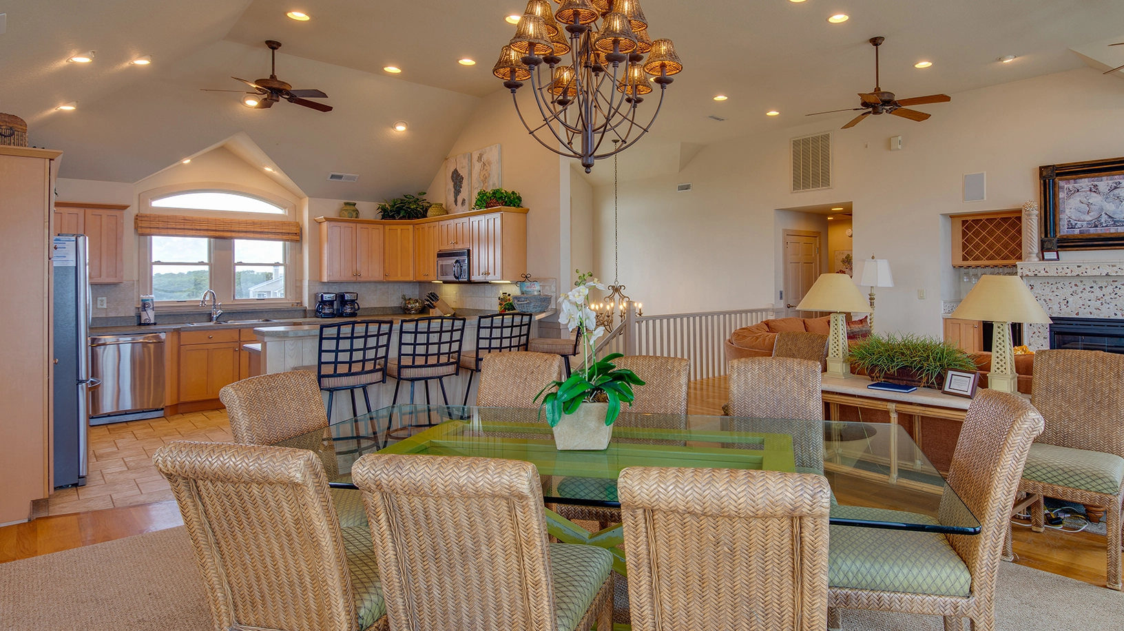Great room with gas fireplace; kitchen; dining area; screened porch.