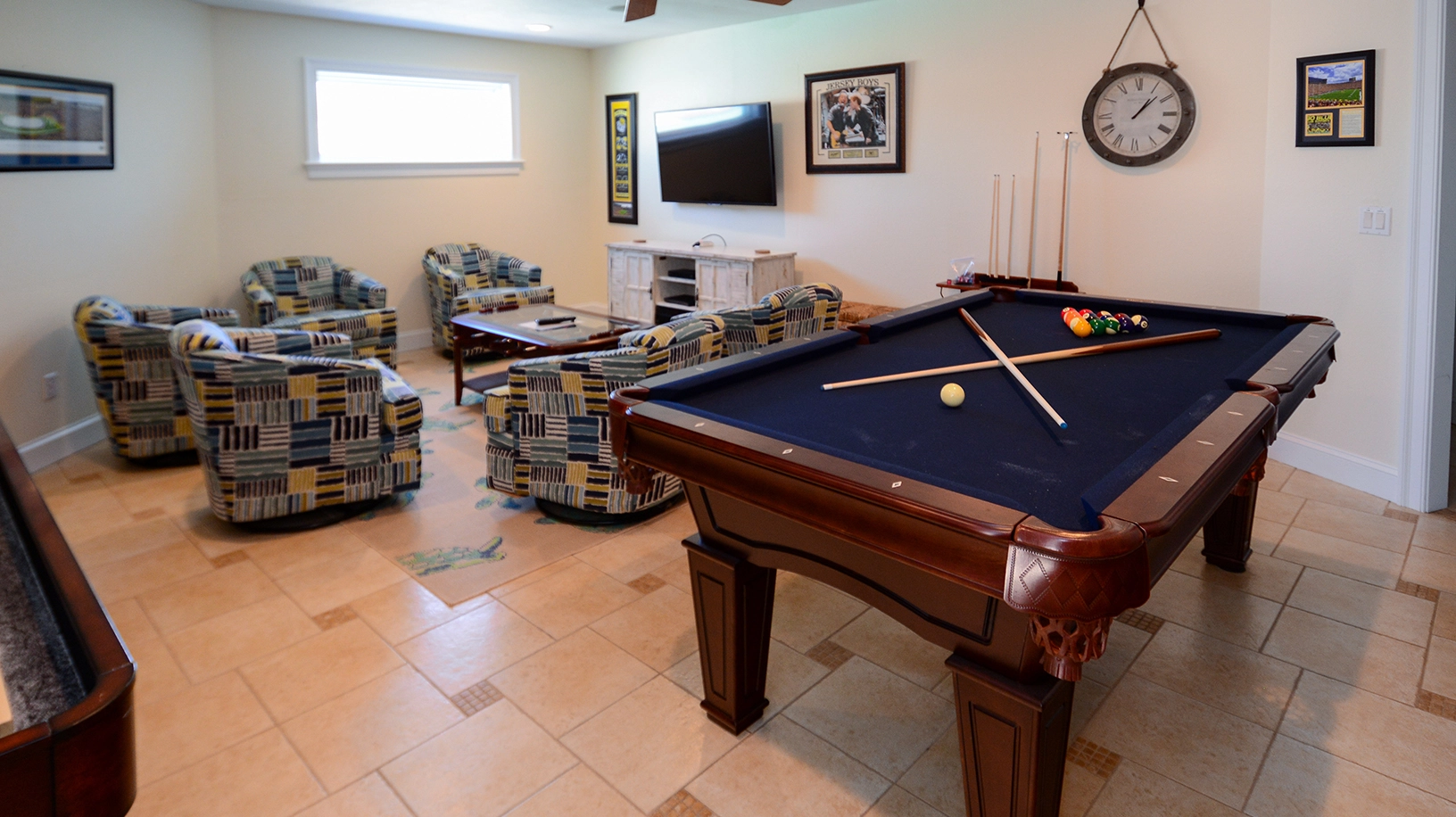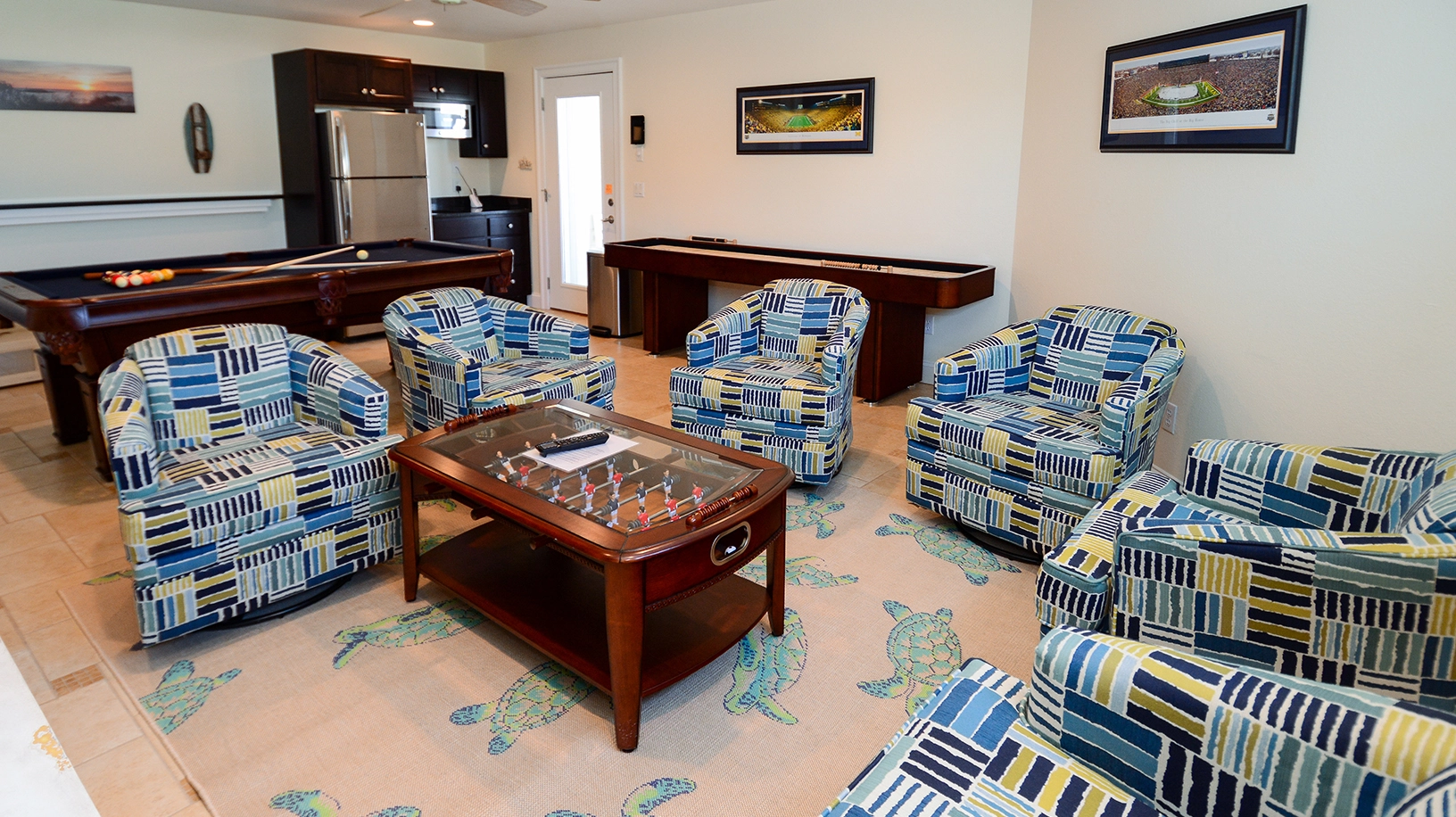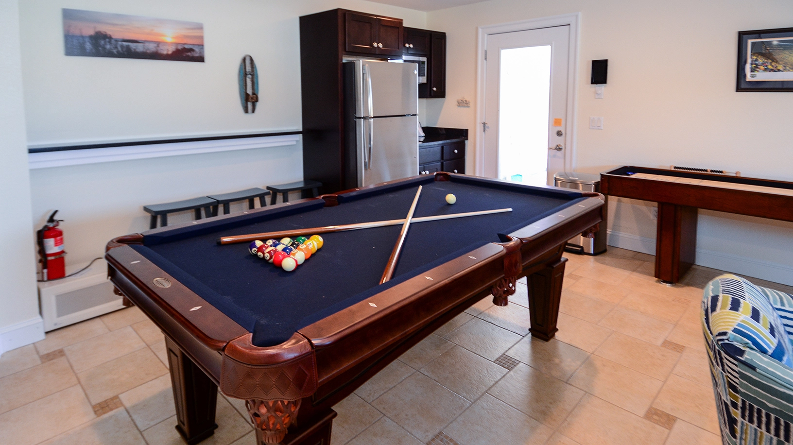 Rec room with pool table, foosball and shuffleboard; wet bar.
