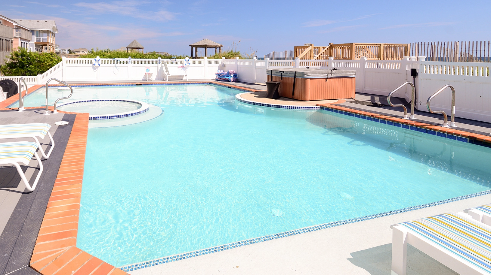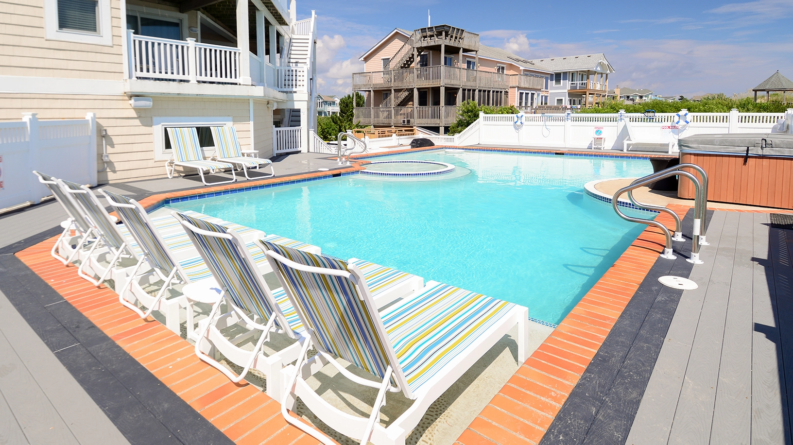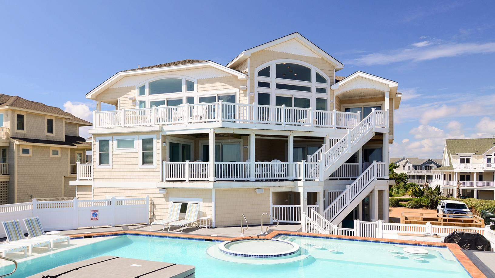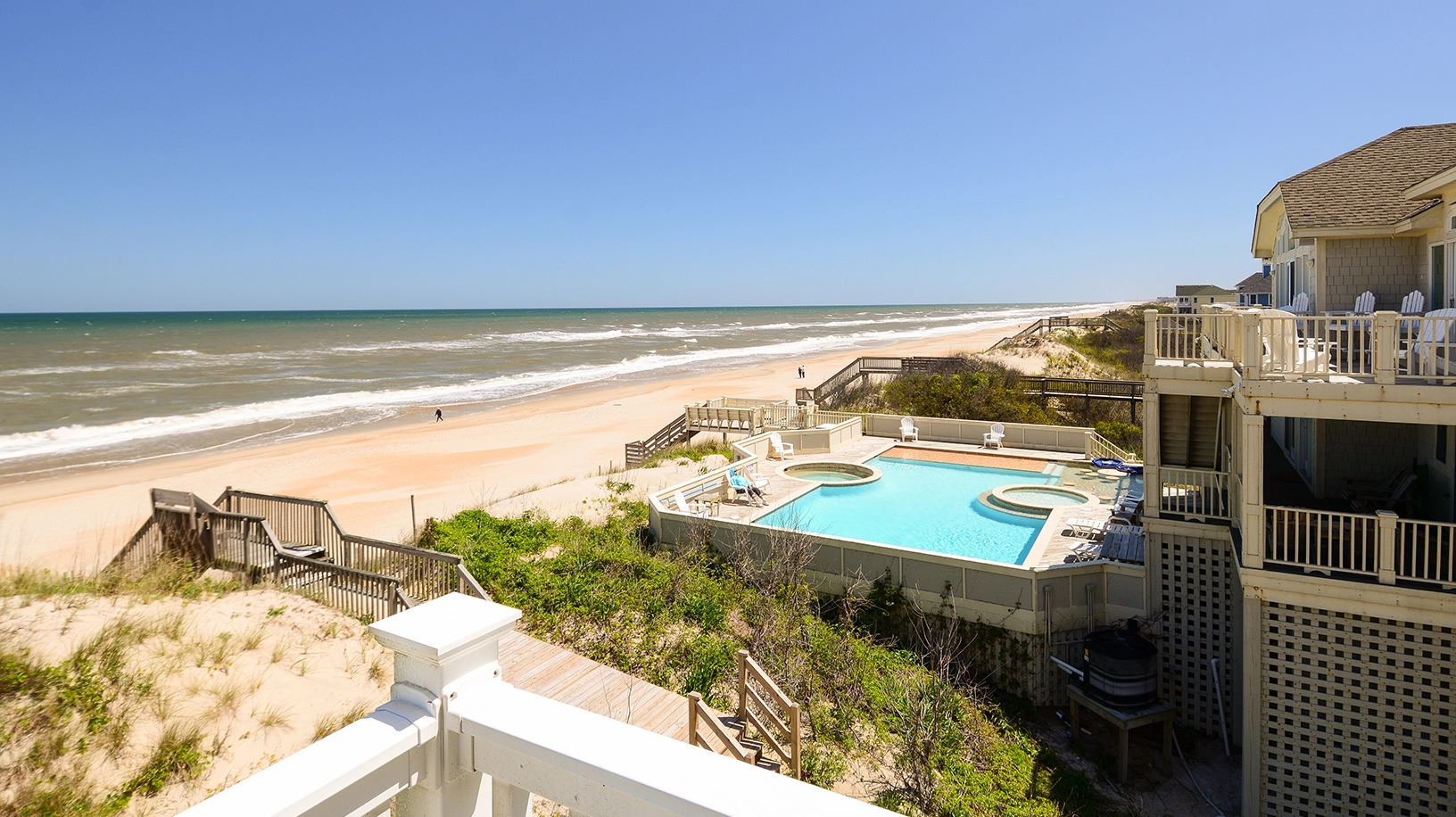 "First time at this location after many years of vacationing in Whalehead and we preferred the street layout of the neighborhood plus the views afforded by the property's orientation. Truly a 180 degree panorama of the ocean from the main public area. Very spacious home, well equipped with beautiful finishes. Dining table was perfect for our group. Handicapped access ramp and elevator was a great help as well. Pool area was large, beautiful and clean. Great access to beach."