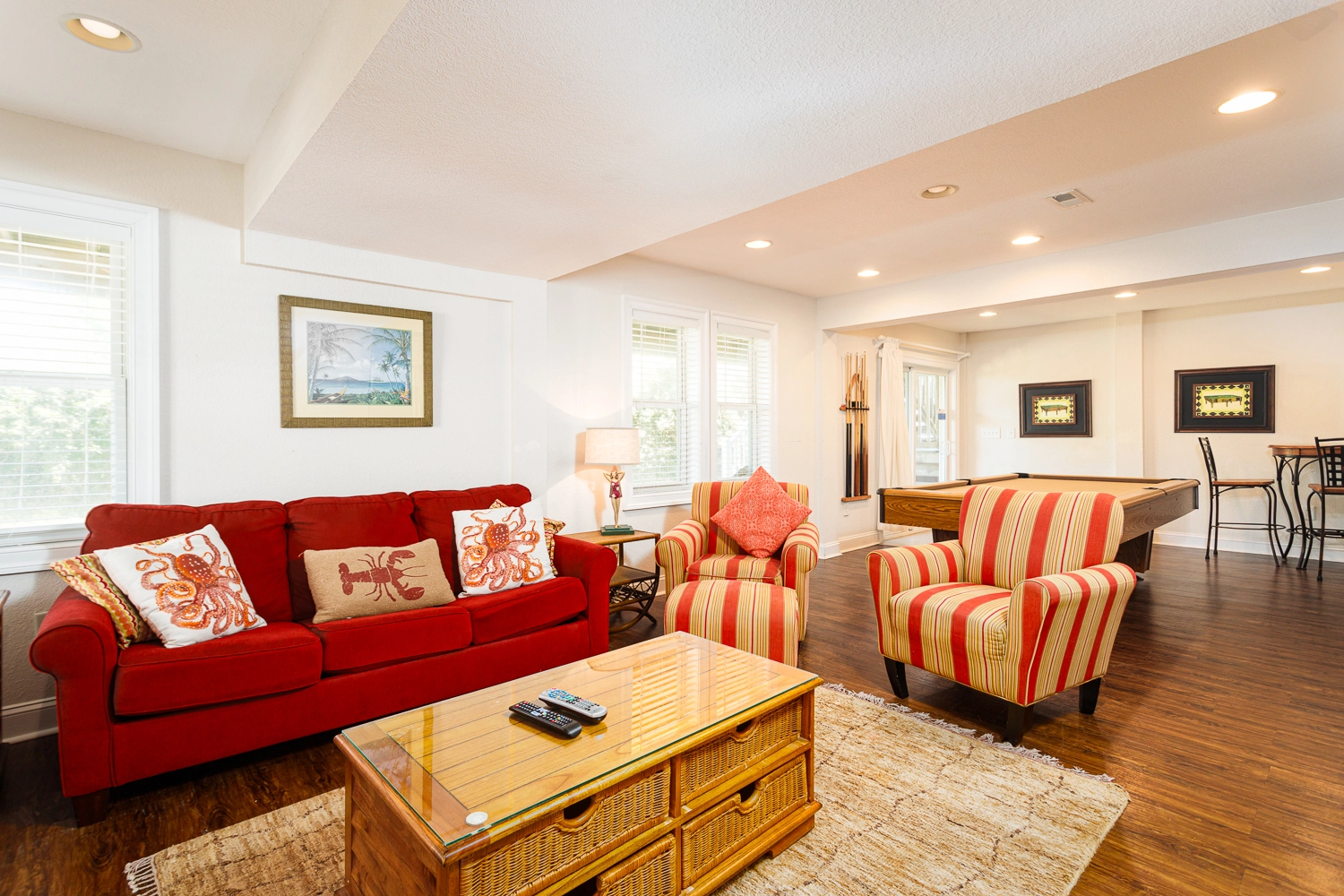 "Our married children and grandchildren loved this house. The location to the beach is wonderful. There are two ovens, two dishwashers, two washing machines, pool, hot tub, pool table, basketball hoop, a table to play games. The living room is small but provides ample seating. There is an upper level where some sat and still enjoyed the television. I had voiced concern about the safety of the deck, for our grandchildren, after reading reviews. The floor of the deck has been replaced with Trex decking. It's perfect! Thank you to the owners for providing a great home for a big family to gather."