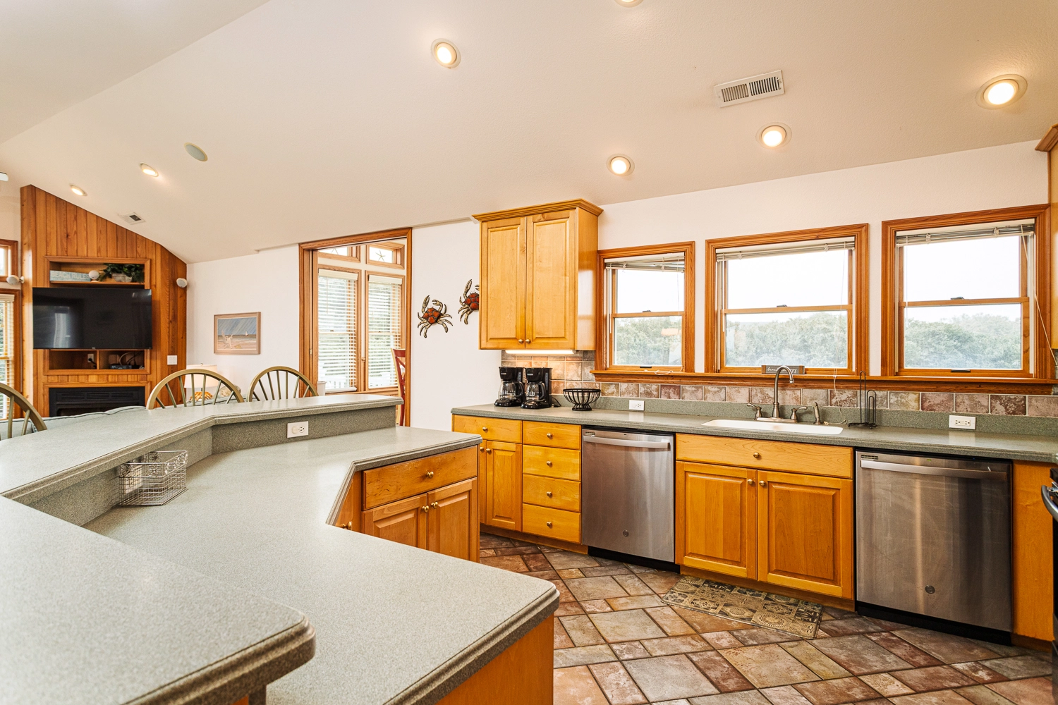 Great room with entertainment center; kitchen with two dishwashers; dining area.
