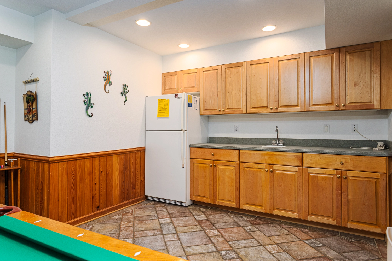 Rec room with pool table, wet bar and full-size refrigerator.