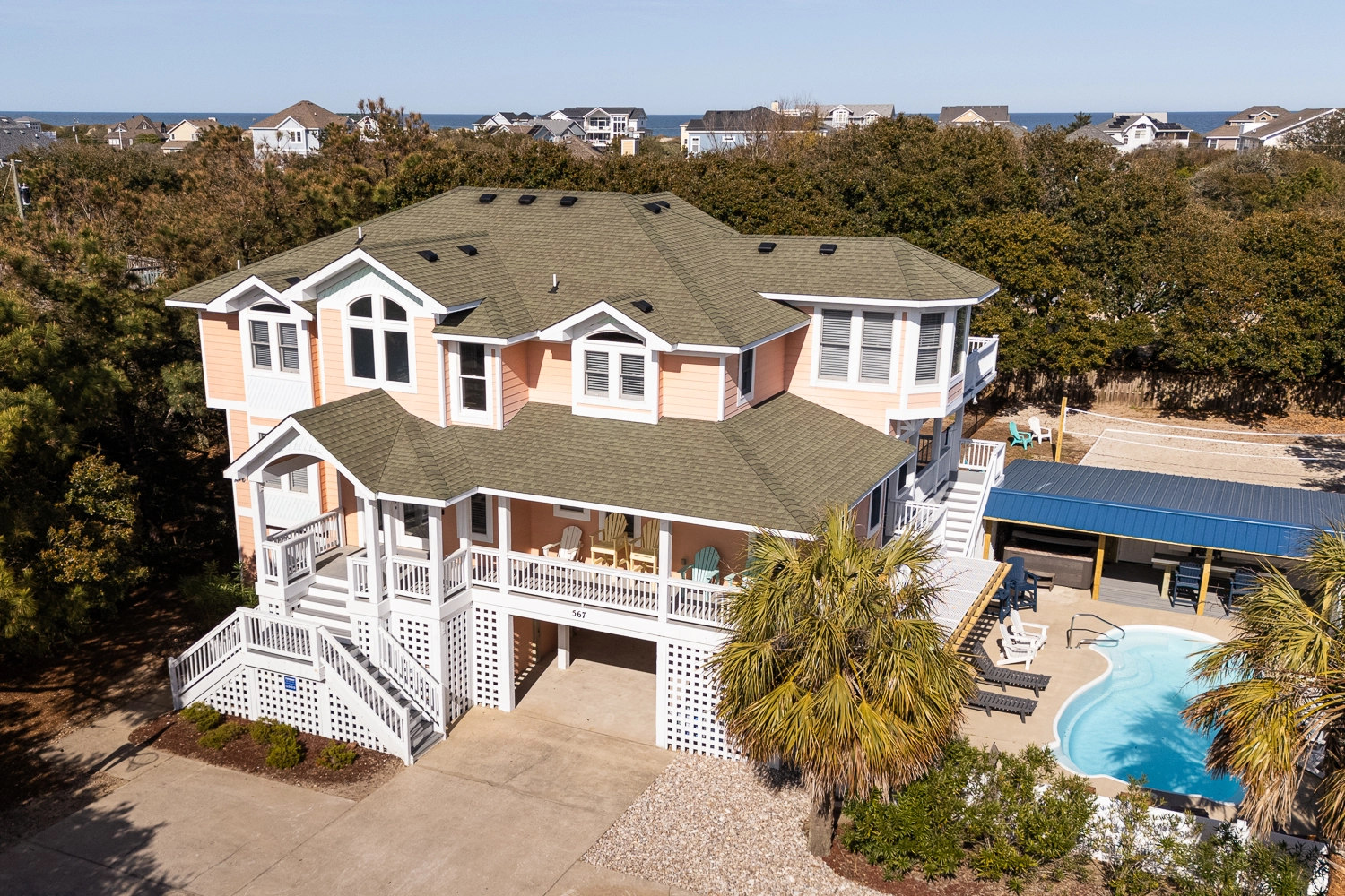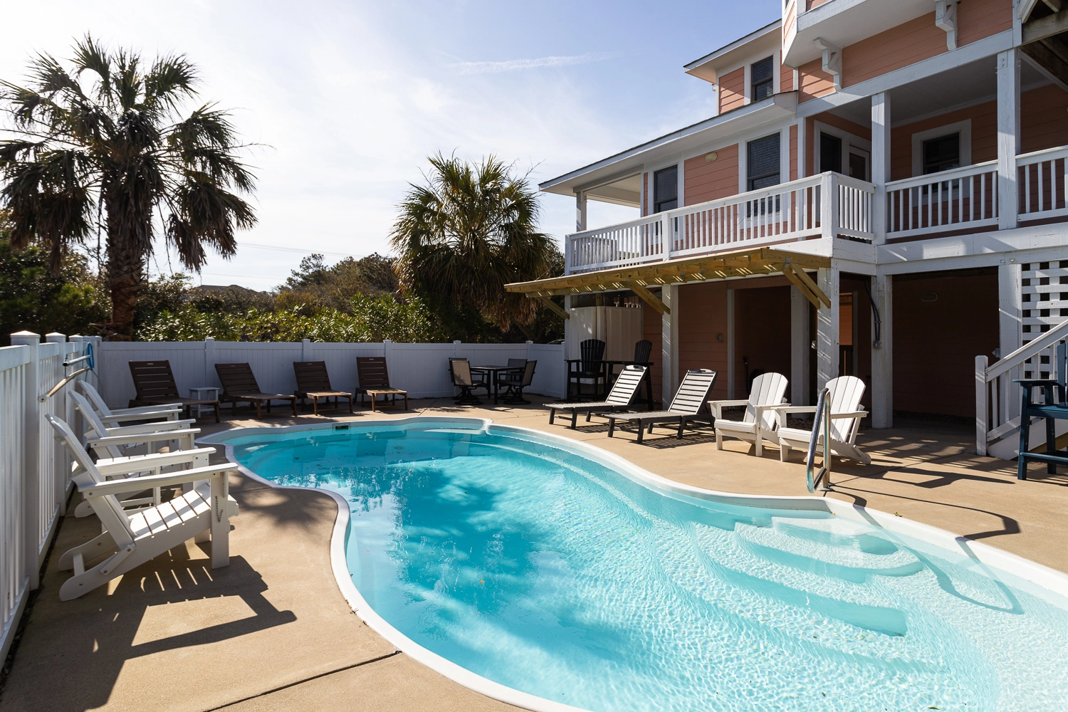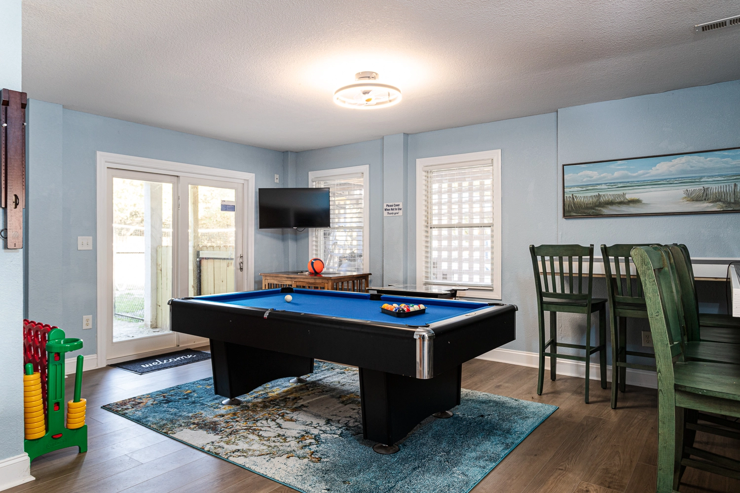 "Private pool, elevator, game room (although Pong game would not allow for 2 players). 8 bedrooms allowed more than enough sleeping arrangements. Close to grocery store and eateries plus a short walk to the beach."