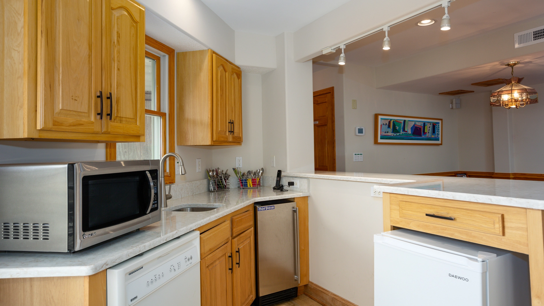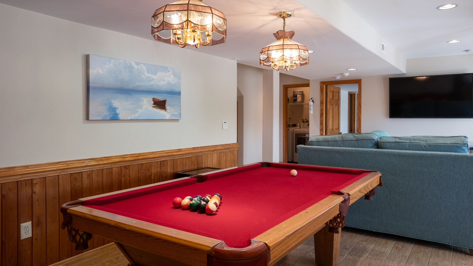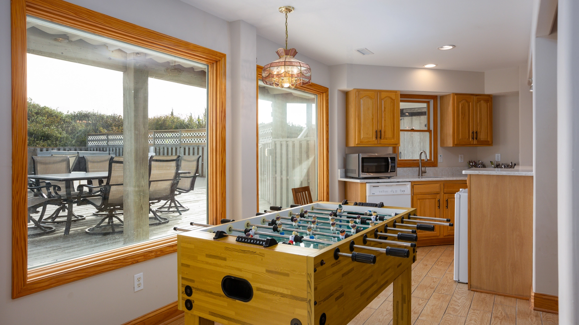 Rec room (QSS) with Bose home theatre system, pool table, foosball, kitchenette with dishwasher, microwave, mini-refrigerator and bar with stools; two full-size refrigerators; laundry.