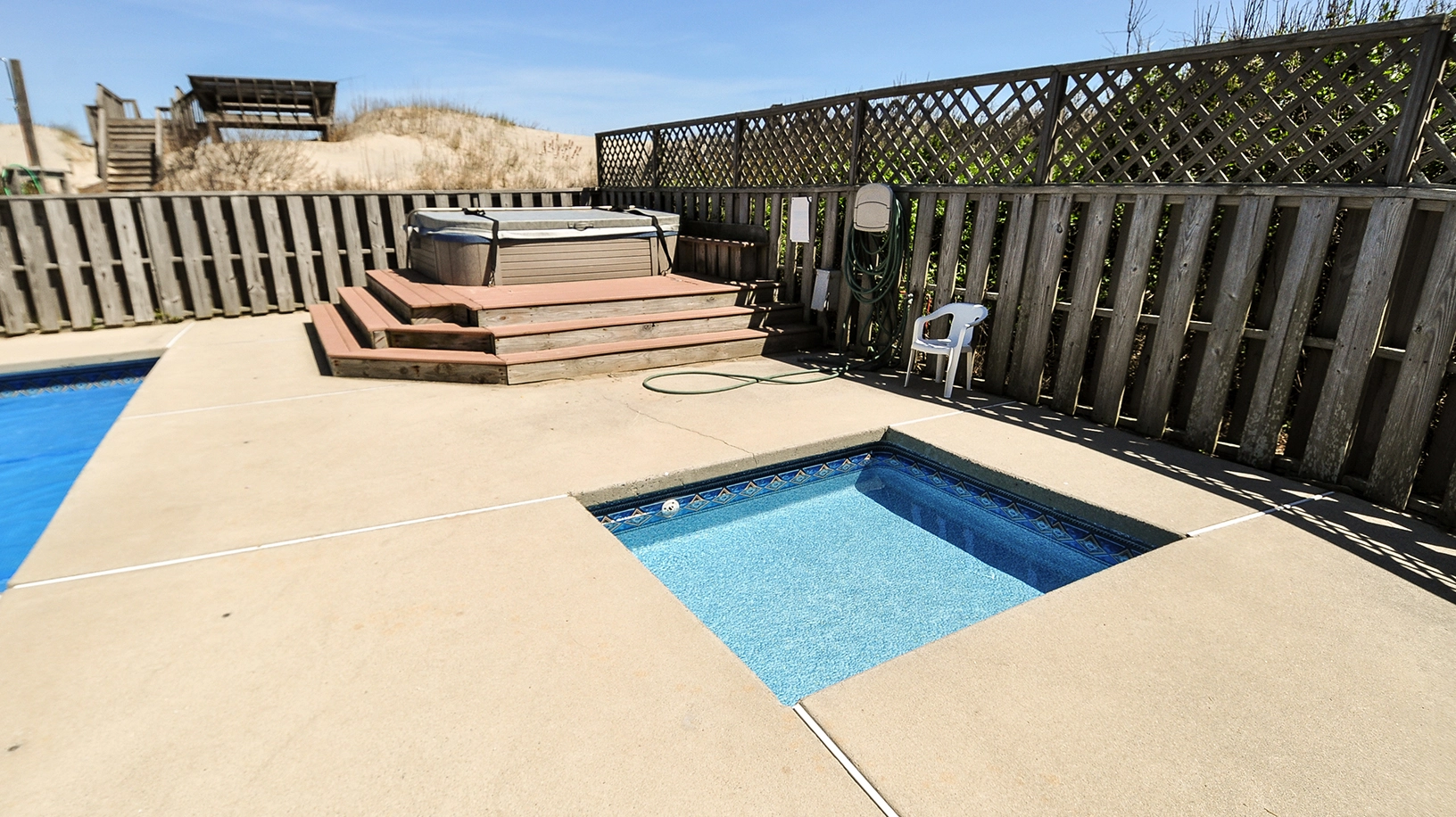 "Baby pool, lots of pool loungers, hot tub."