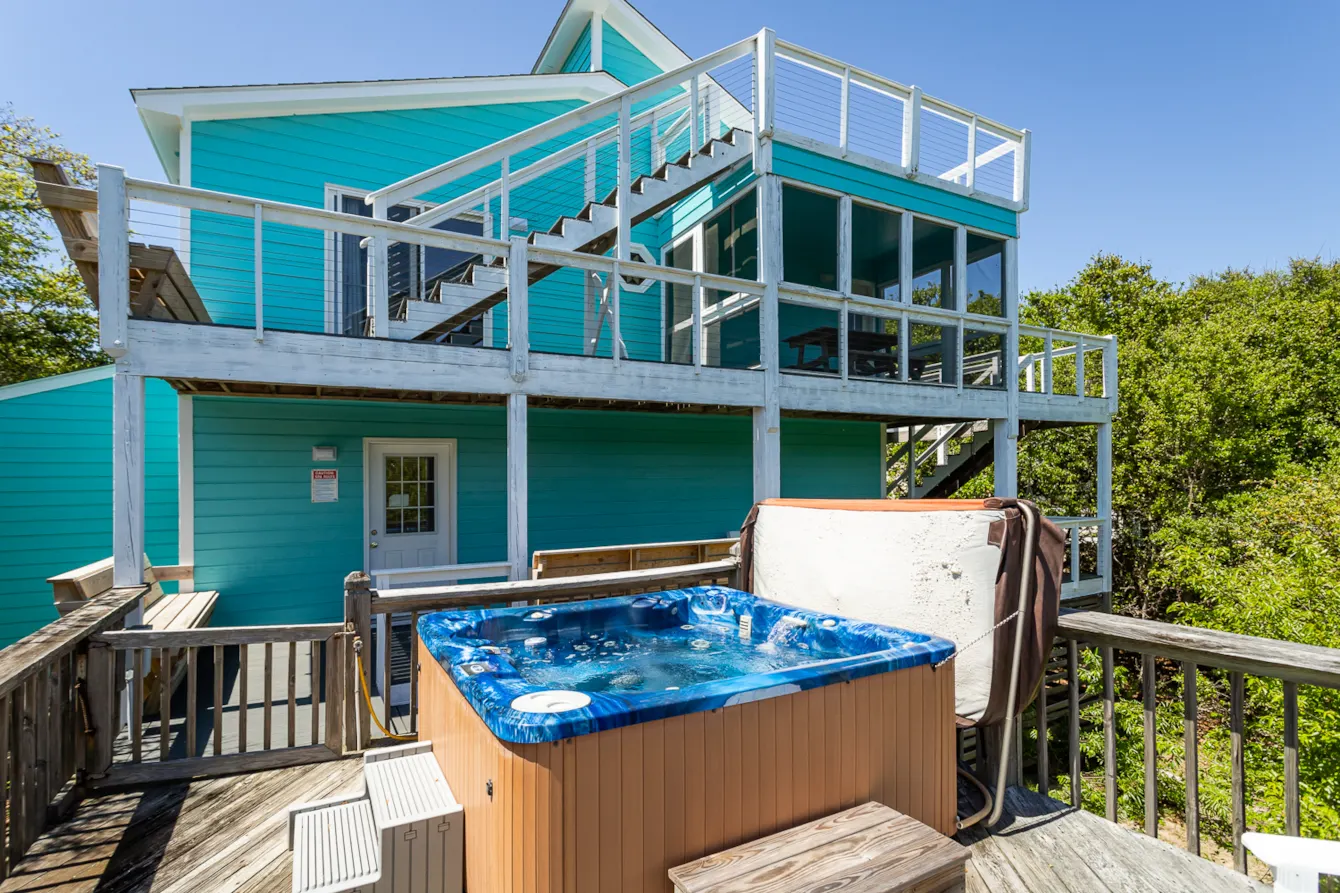 "The house is surrounded by live oaks and set back from the street. Lots of pleasant bird songs. You can enjoy the many recently restored decks, the screened porch, swing and hot tub feeling like you’re in a natural OBX setting. We also loved the rooftop deck from which we enjoyed sunsets and glimpses of the ocean."