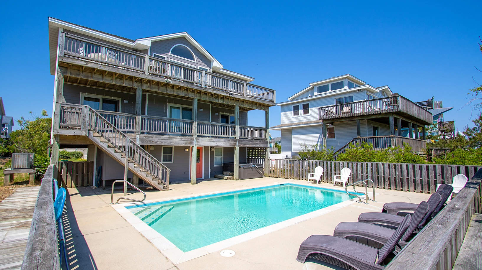 "Beautiful home. Nicely decorated . Close to Ocean and the grocery store! A plus! Exterior decking, outside furniture , poolside area and shower all are in much needed renovation . A huge contrast to interior of the house! Hot Tub cover and beach chairs all need replacement."
