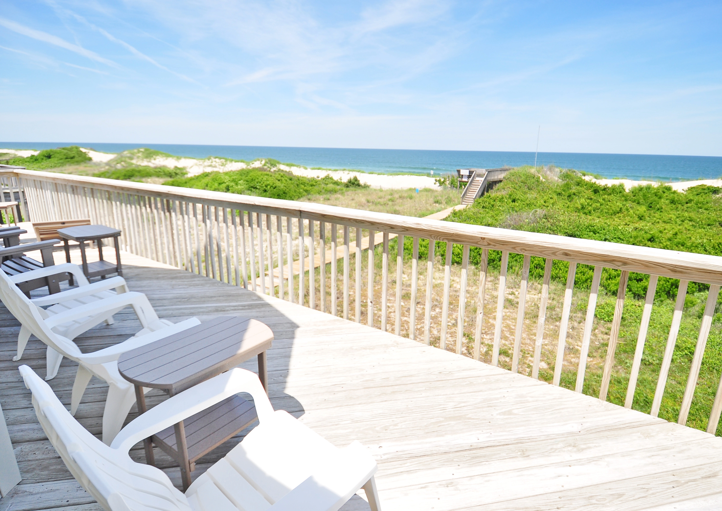 "The home has a large third floor gathering space with an ocean view. The walkway to the beach is right off your patio."