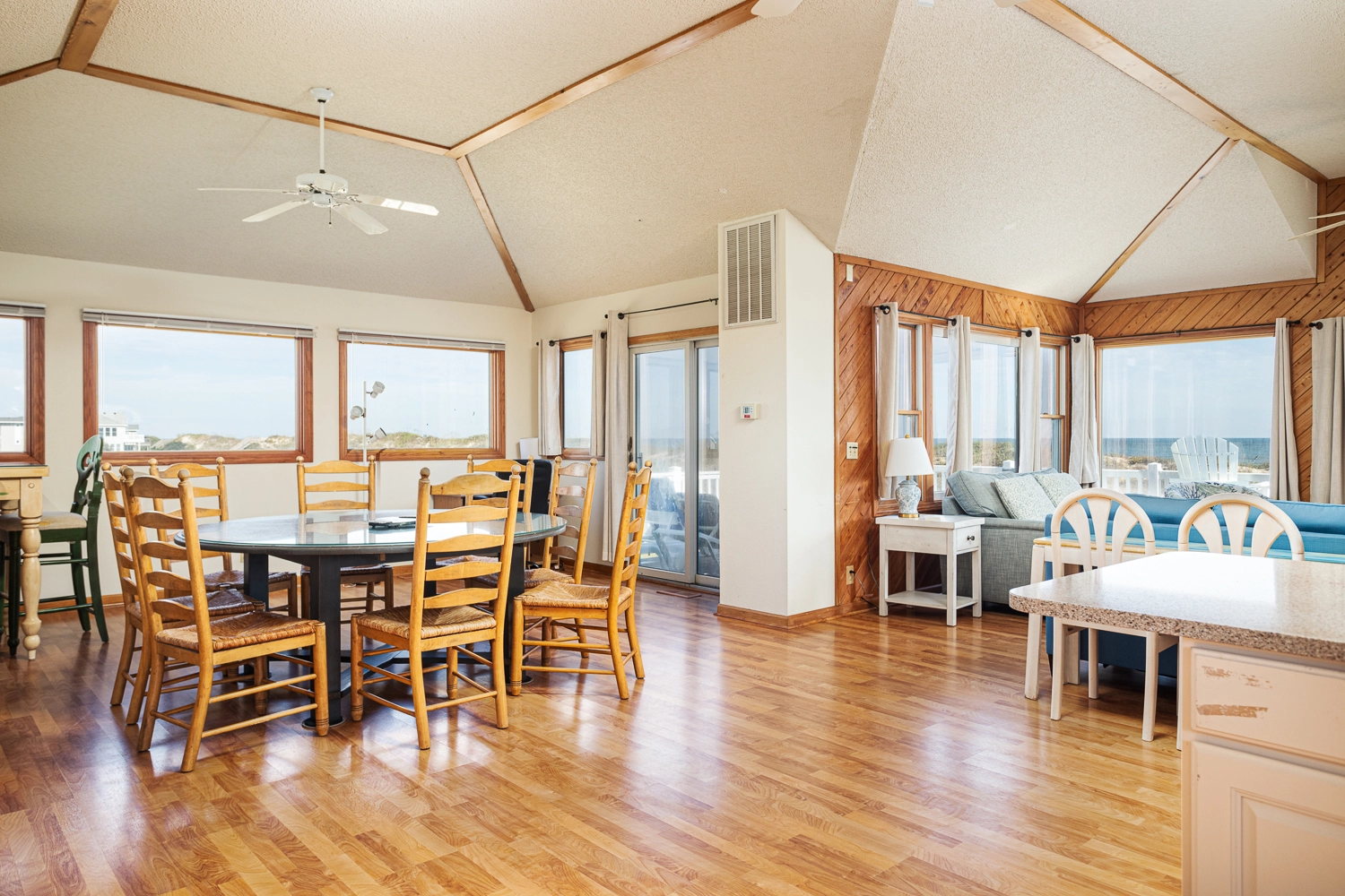 Great room; kitchen with breakfast bar; dining area; sun deck with ocean views.