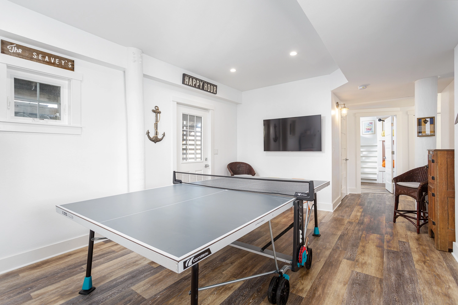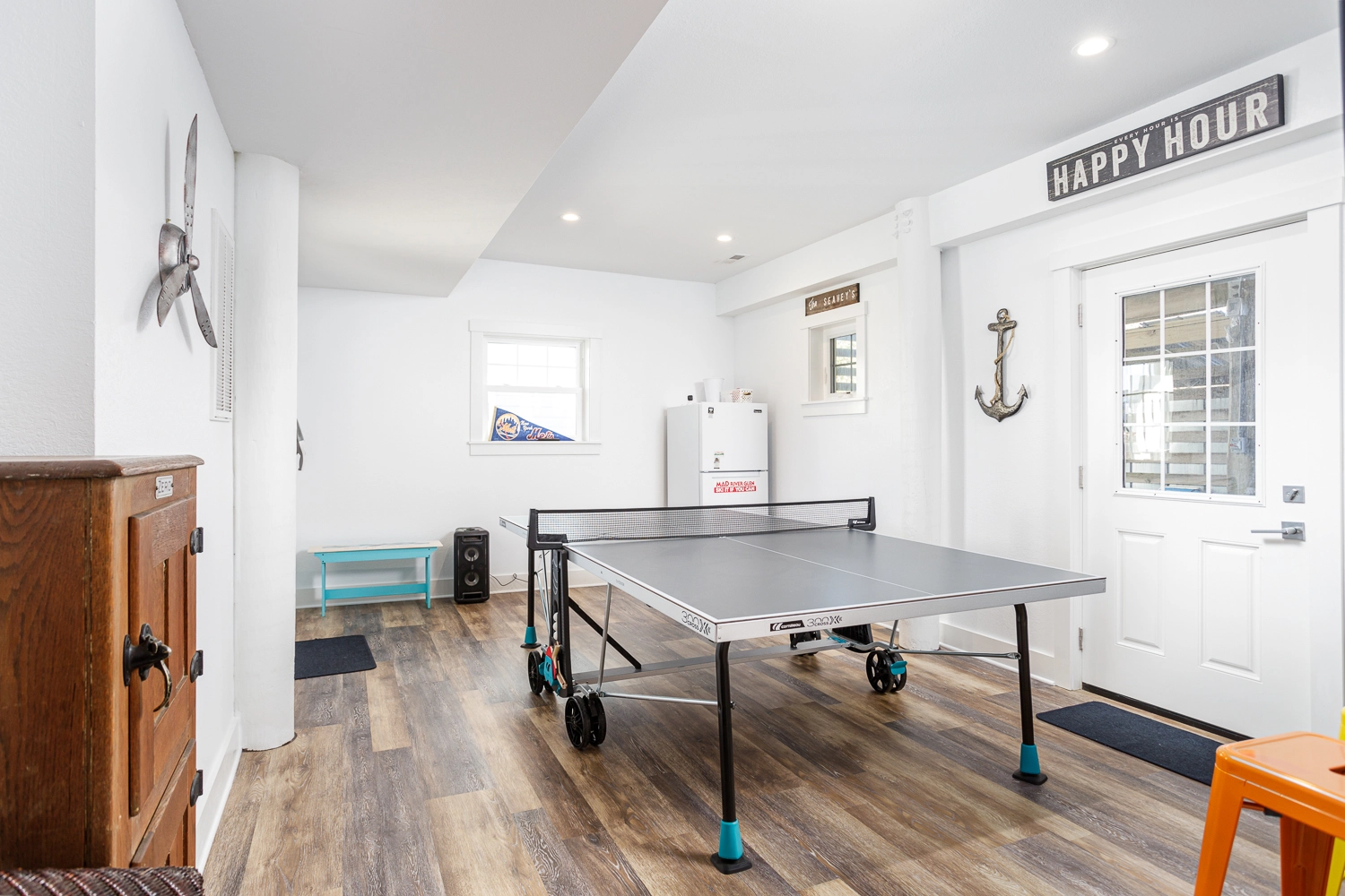 Rec room with ping pong table and refrigerator; laundry.